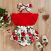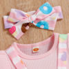 Baby Girls Outfits Set Fake Two Piece Suspender Bowknot Patchwork Donut/Flower Printed Ruffle Triangle Romper with Headband