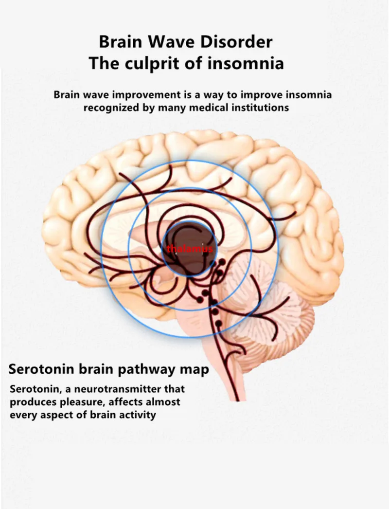 2. Dreamate intelligent sleep instrument performs neural regulation by sending low-frequency pulses of a specific frequency to the target area responsible for the release of endorphins in the brain, and reaches the advanced center of the cerebral cortex through the supraframe nerve. They will regulate signals from various biological and physical channels, activate the human endorphin system and help the human body restore sleep function.