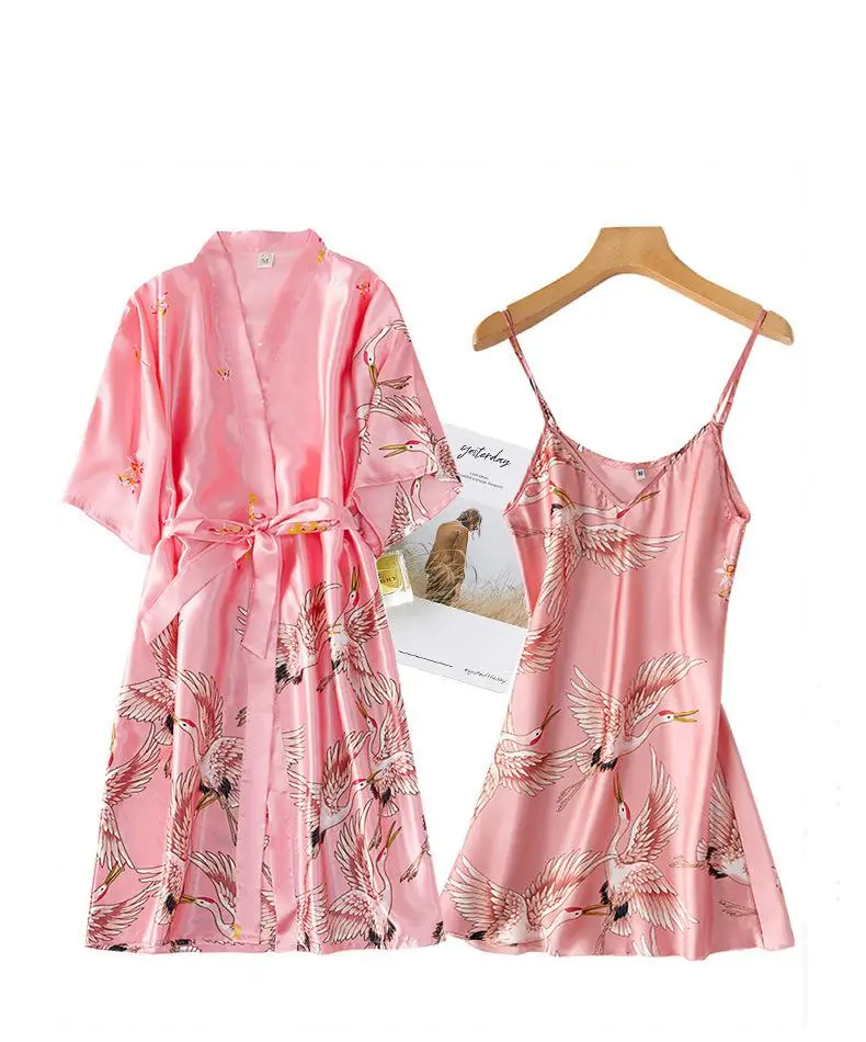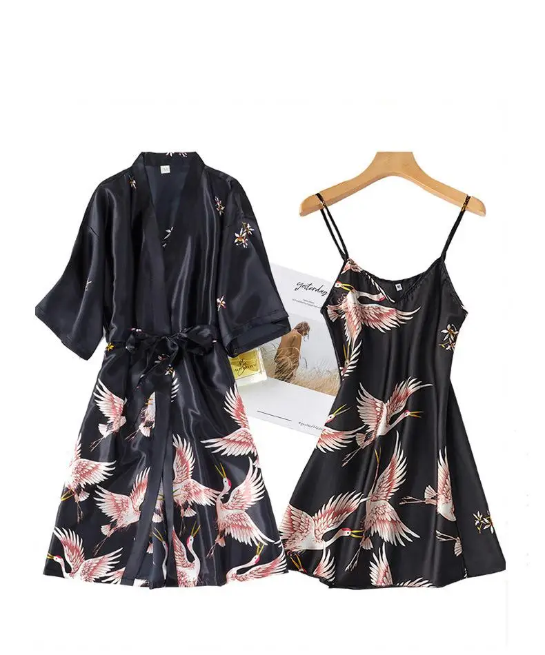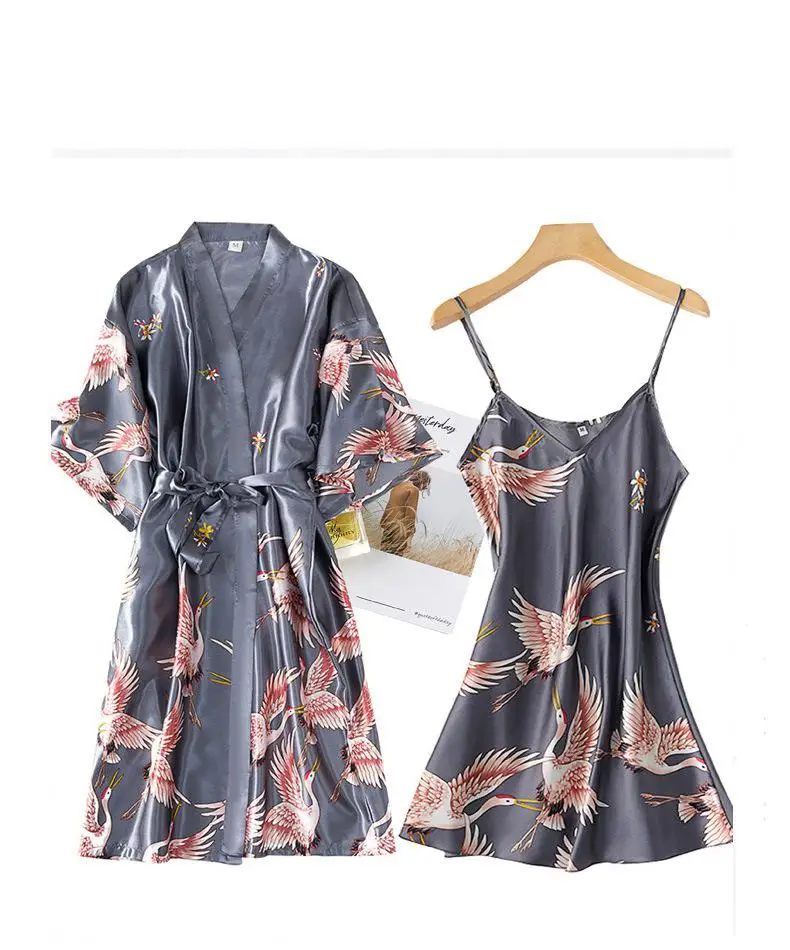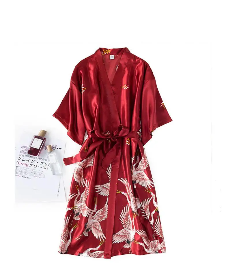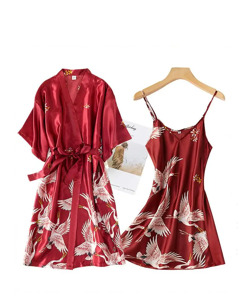 Burgundy Women 2PCS Faux Silk Kimono Robe Gown Sets Sexy Print Crane Nightdress &Bathrobe Lingerie Nightgown Summer Sleepwear
