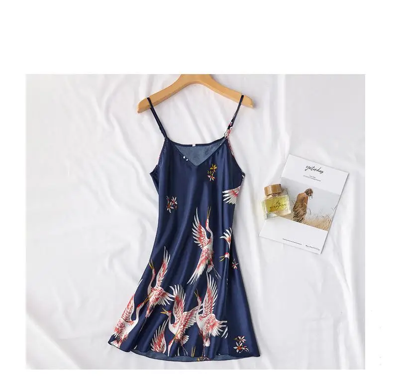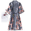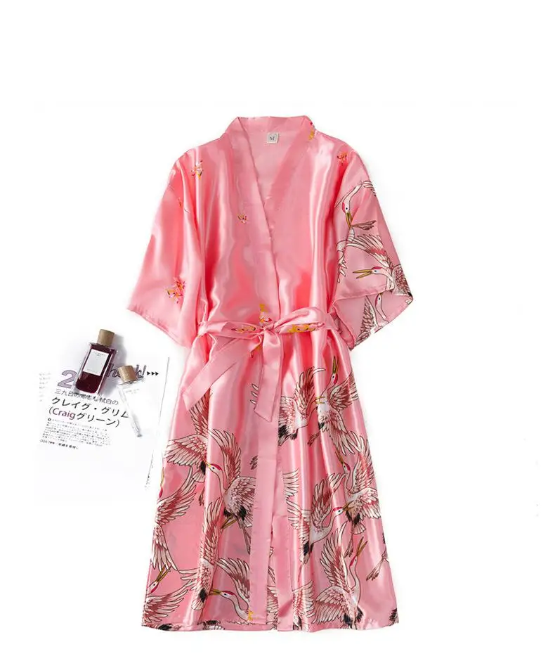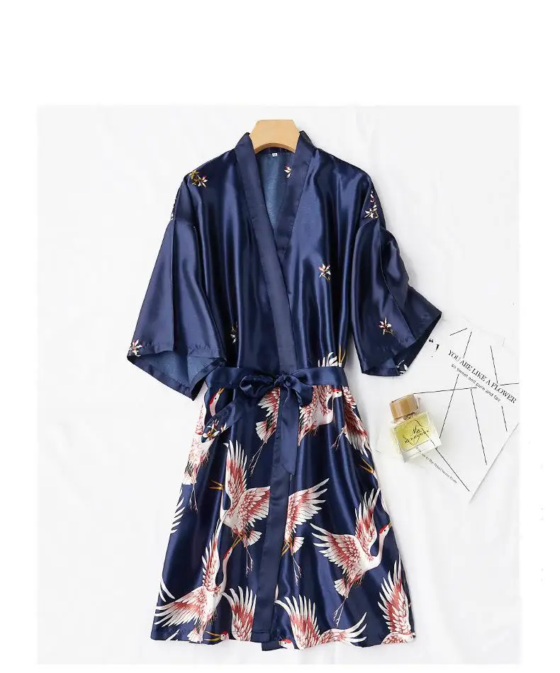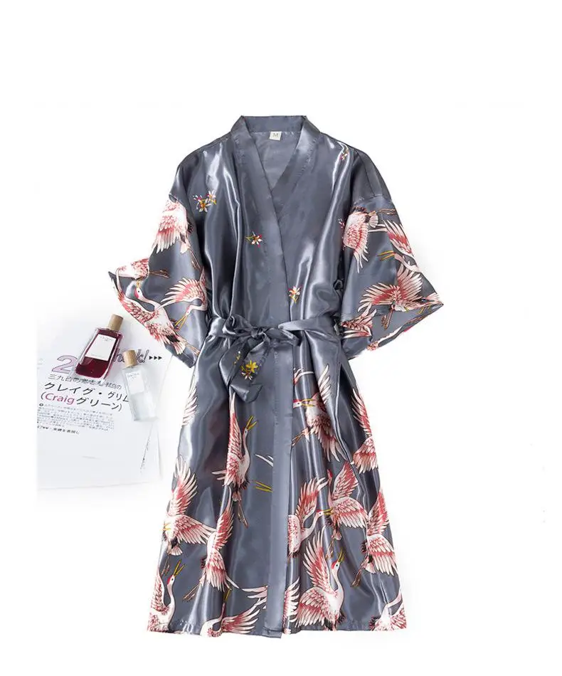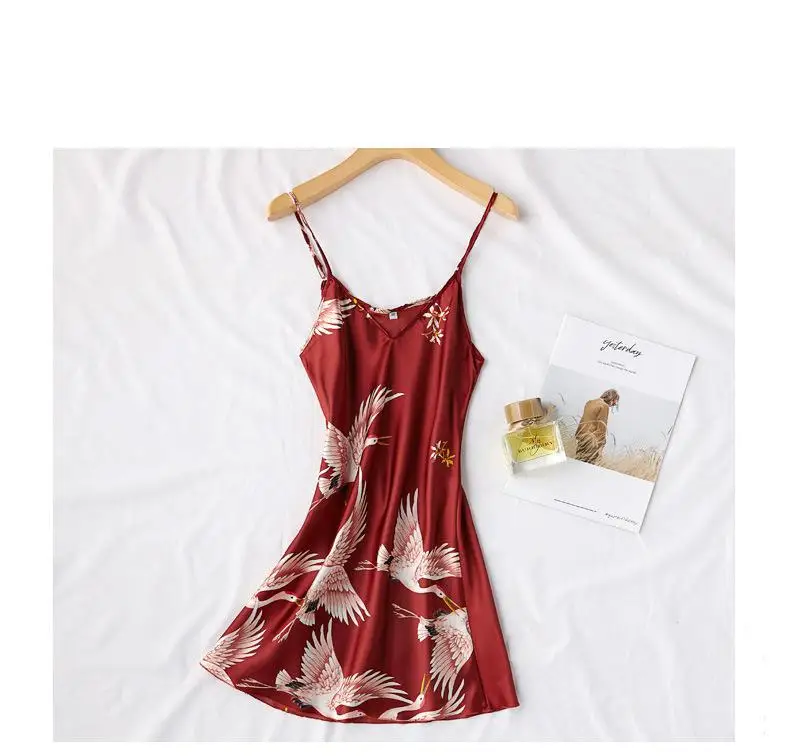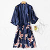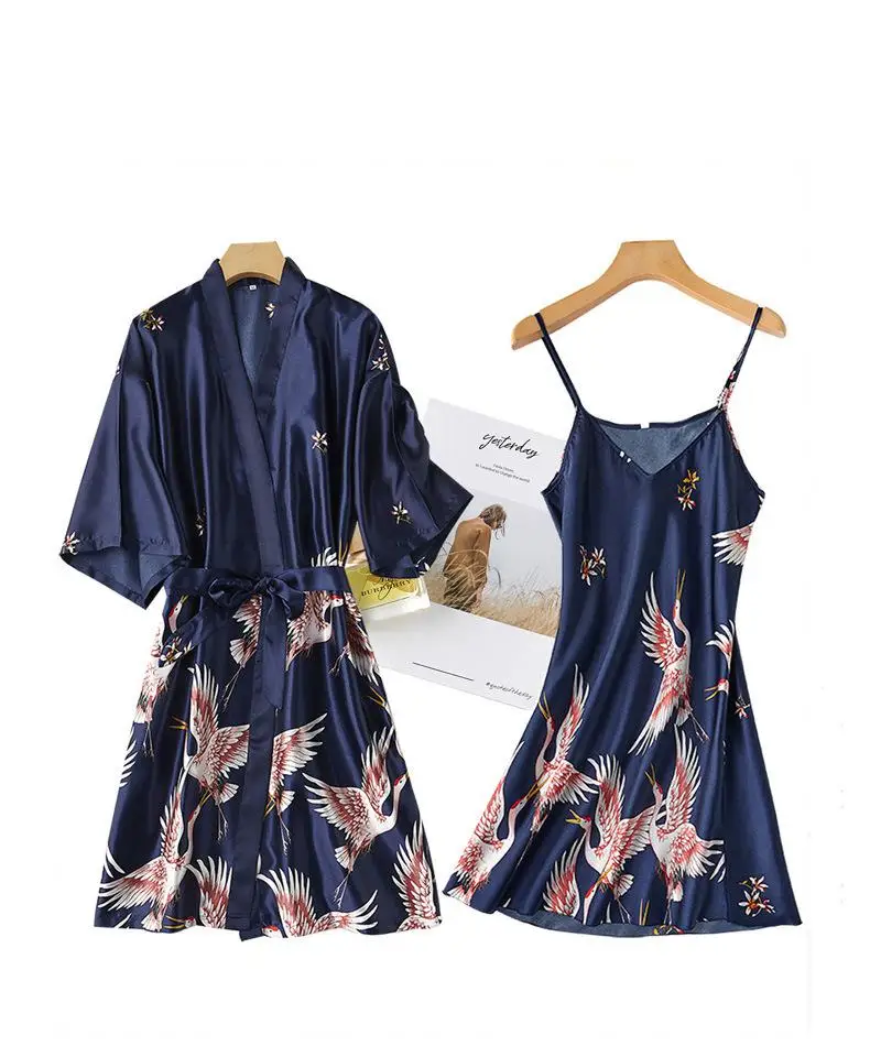 Burgundy Women 2PCS Faux Silk Kimono Robe Gown Sets Sexy Print Crane Nightdress &Bathrobe Lingerie Nightgown Summer Sleepwear
