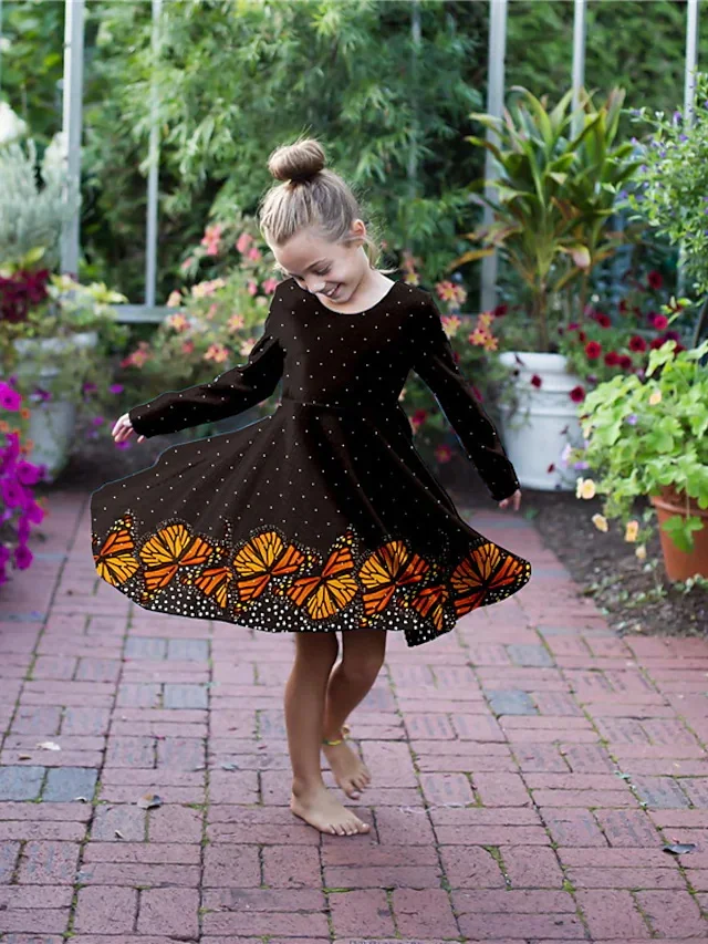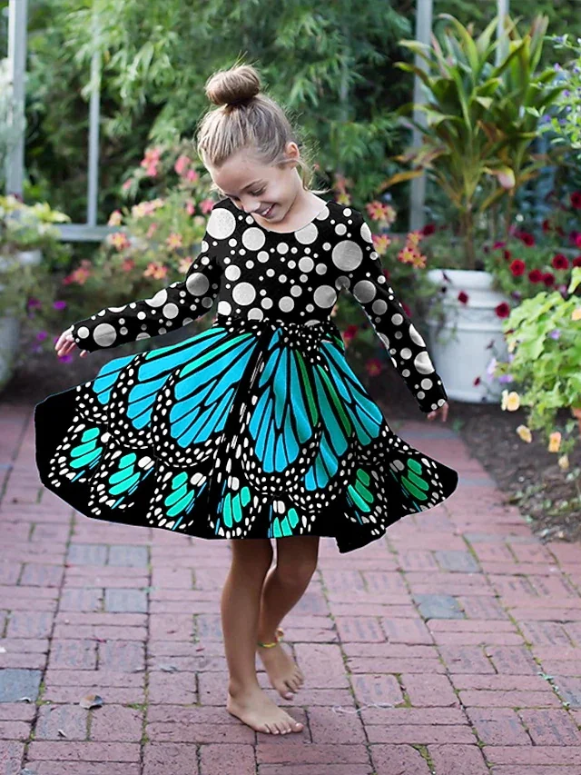 Children’s Clothing Long Sleeved Dress Large Swing Skirt Round Neck Butterfly Origin
