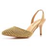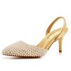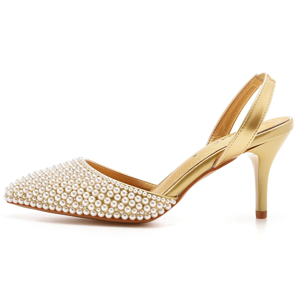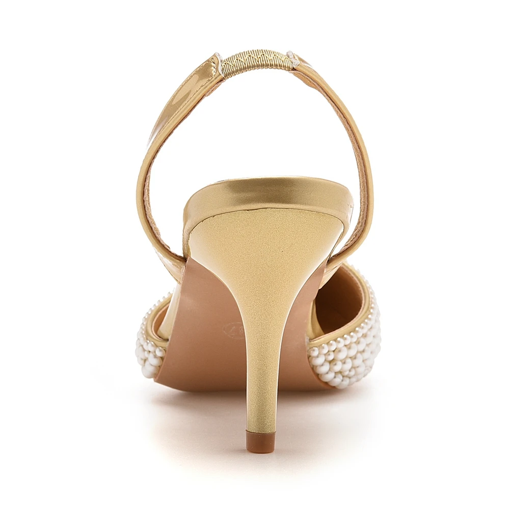 Crystal Queen Women Gold Pearl Pumps Slingback High Heels Elegant Medium Lady Stiletto Sexy Wedding Shoes