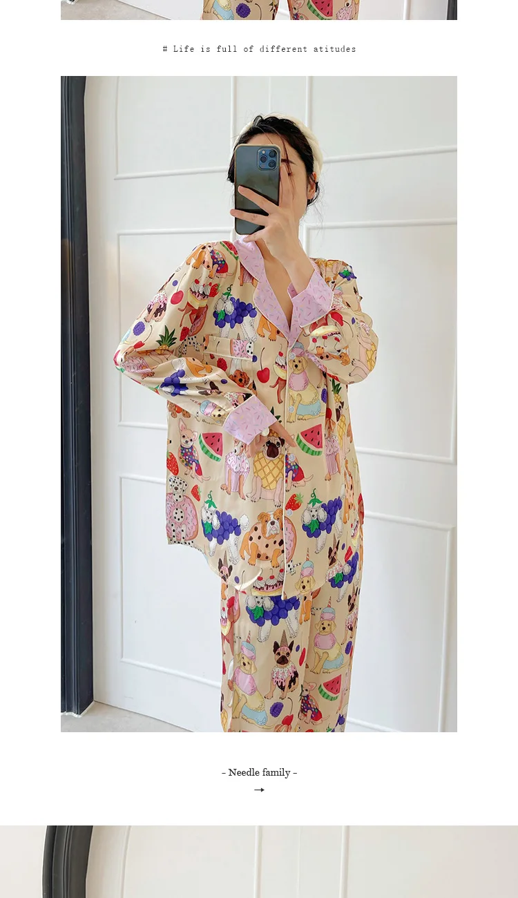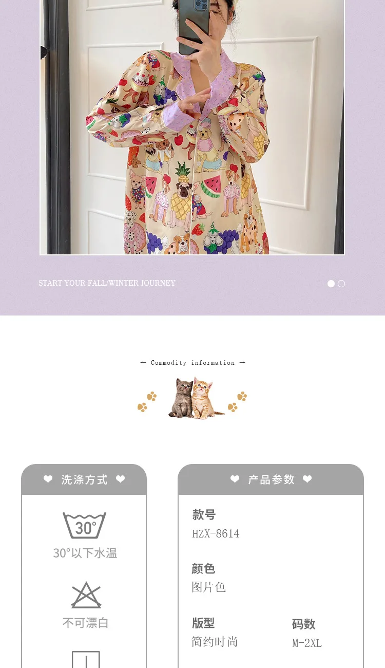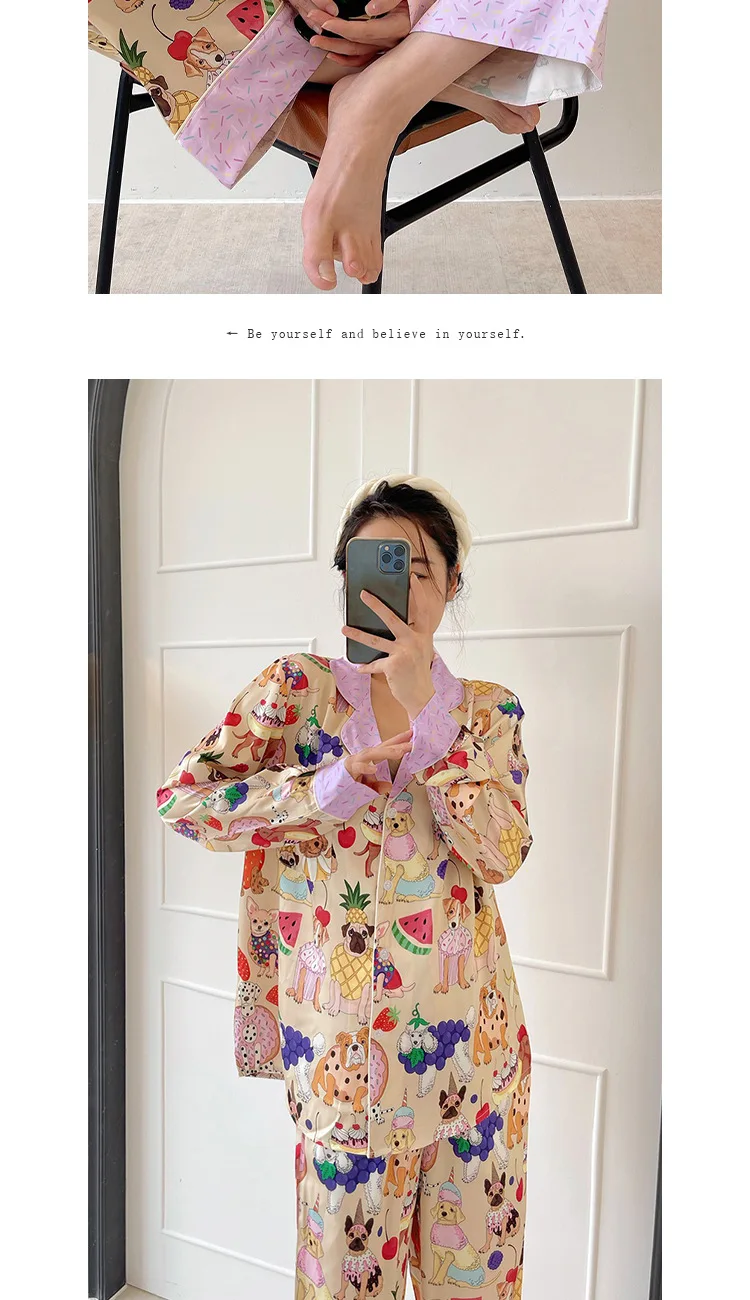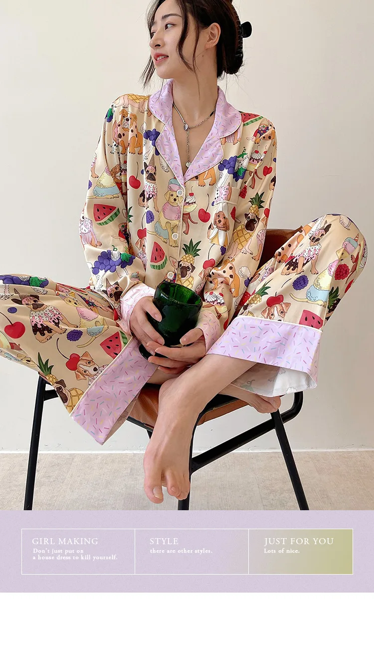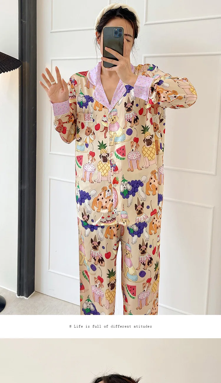 Cute Temperament Fashionable Zhao Lusi Style Long Sleeved Pants Satin Pajama Women’s Home Clothes Luxury Silk Pajamas for Women