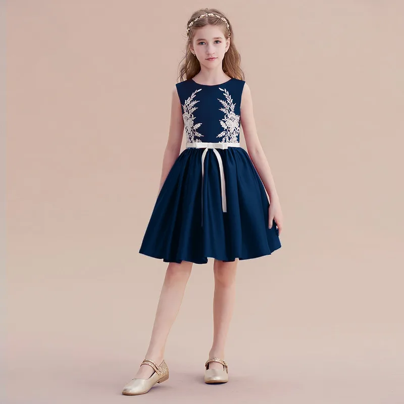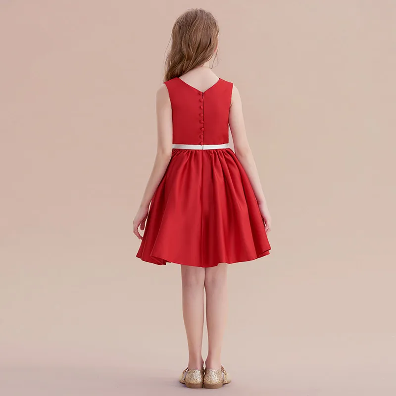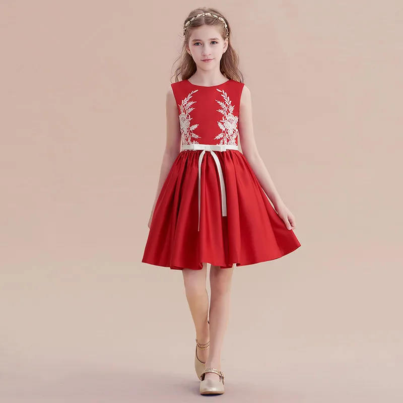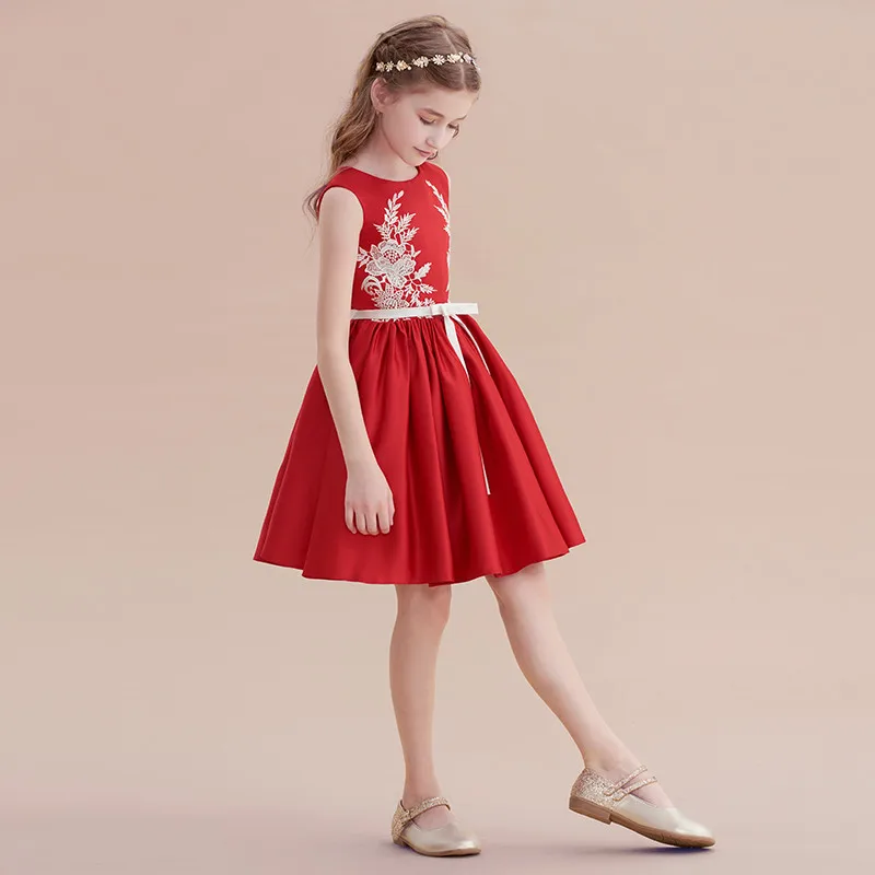 Dideyttawl Red Satin Lace Applique Flower Girl Dress Formal Evening Birthday Party Gown For Kids Knee Length Junior Concert