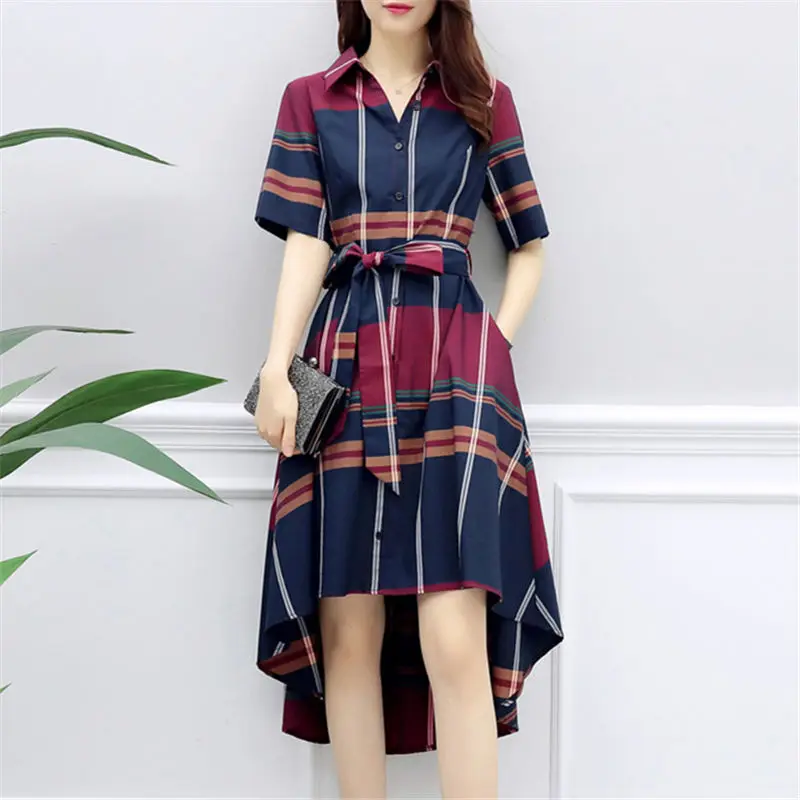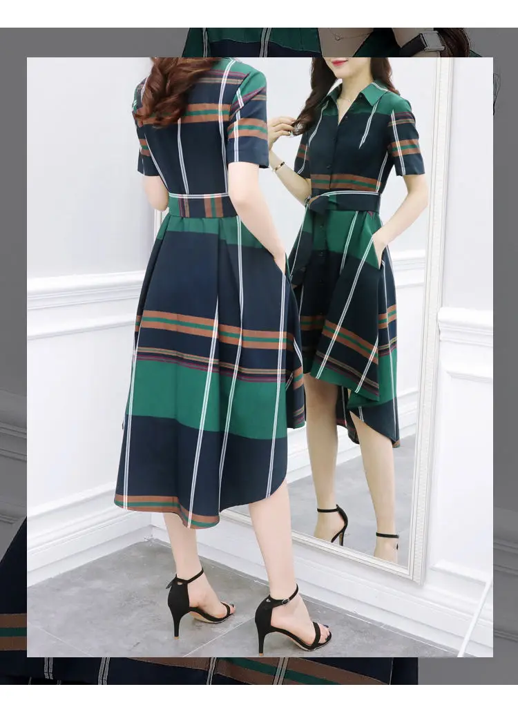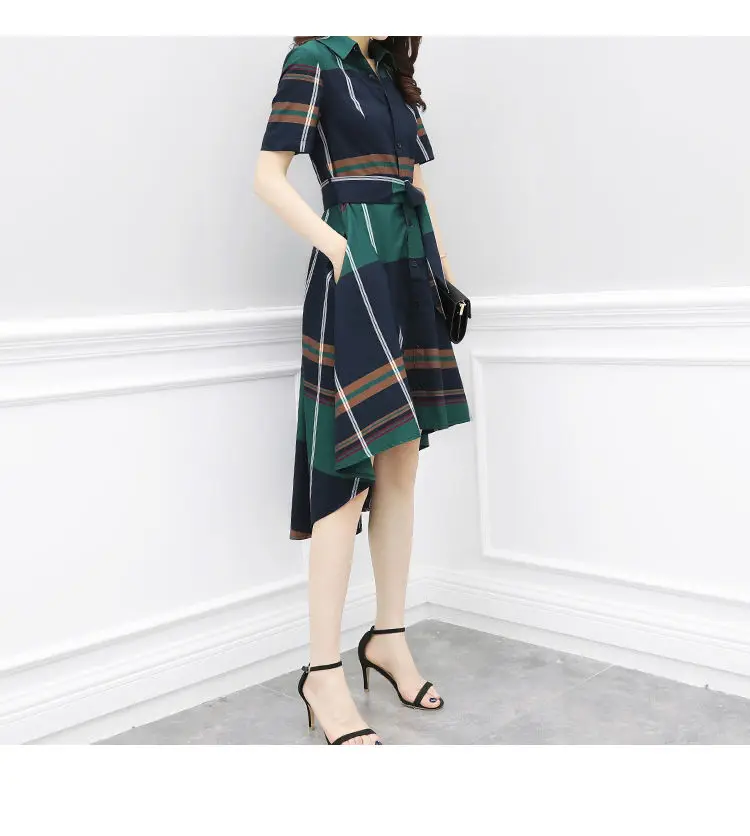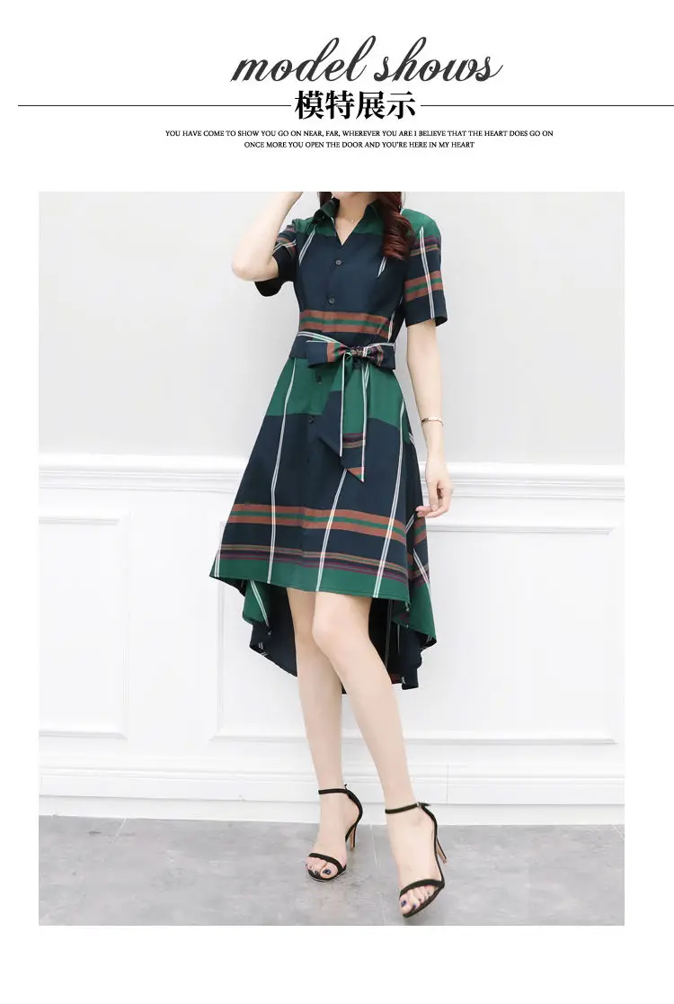 Elegant Fashion Plaid Belt Bow Asymmetrical Long Dresses Summer 2023 New Short Sleeve Polo-neck Tunic Midi Dress Female Clothing
