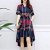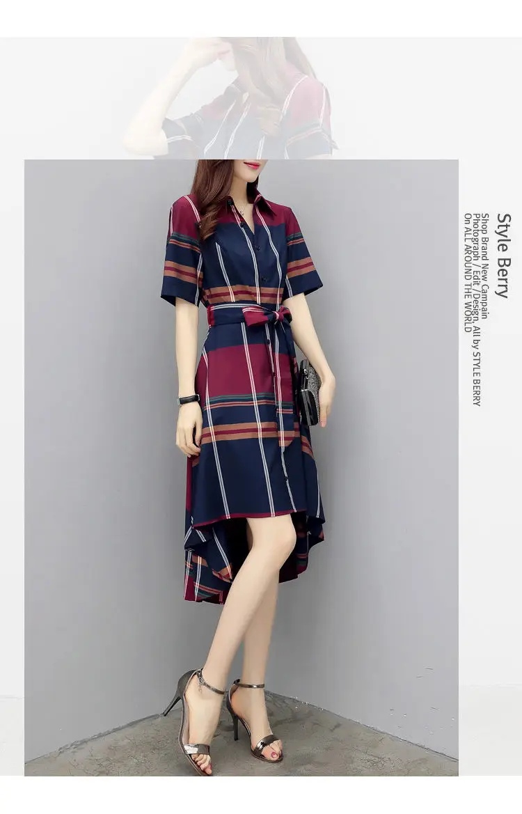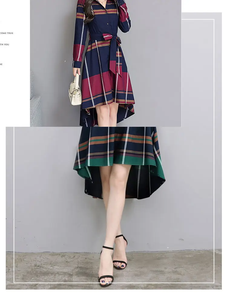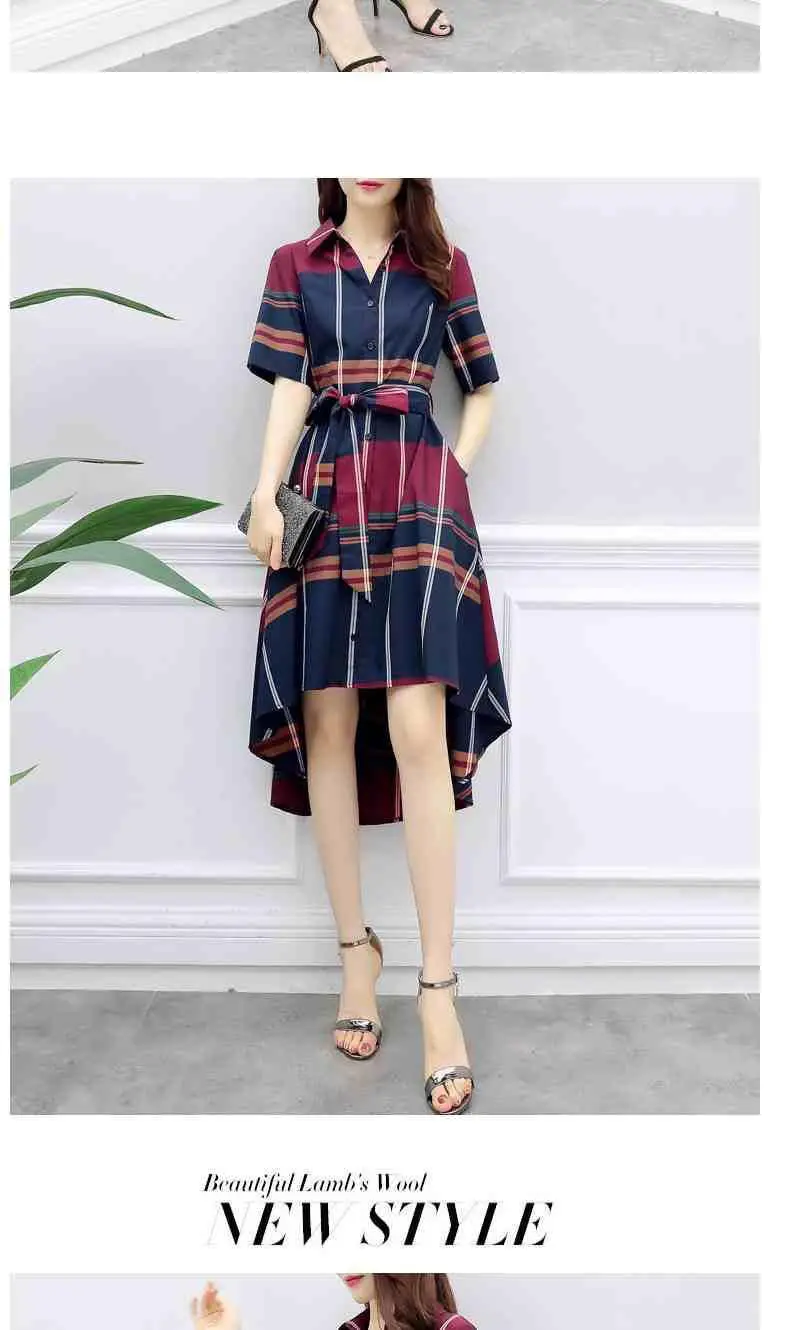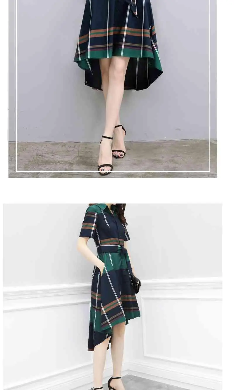 Elegant Fashion Plaid Belt Bow Asymmetrical Long Dresses Summer 2023 New Short Sleeve Polo-neck Tunic Midi Dress Female Clothing