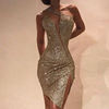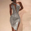 Elegant Ladies Sleeveless Irregular Designer Dress Sexy Slant Neck Sequin Hip Wrap Dress Fashion One Shoulder Slim Split Dresses