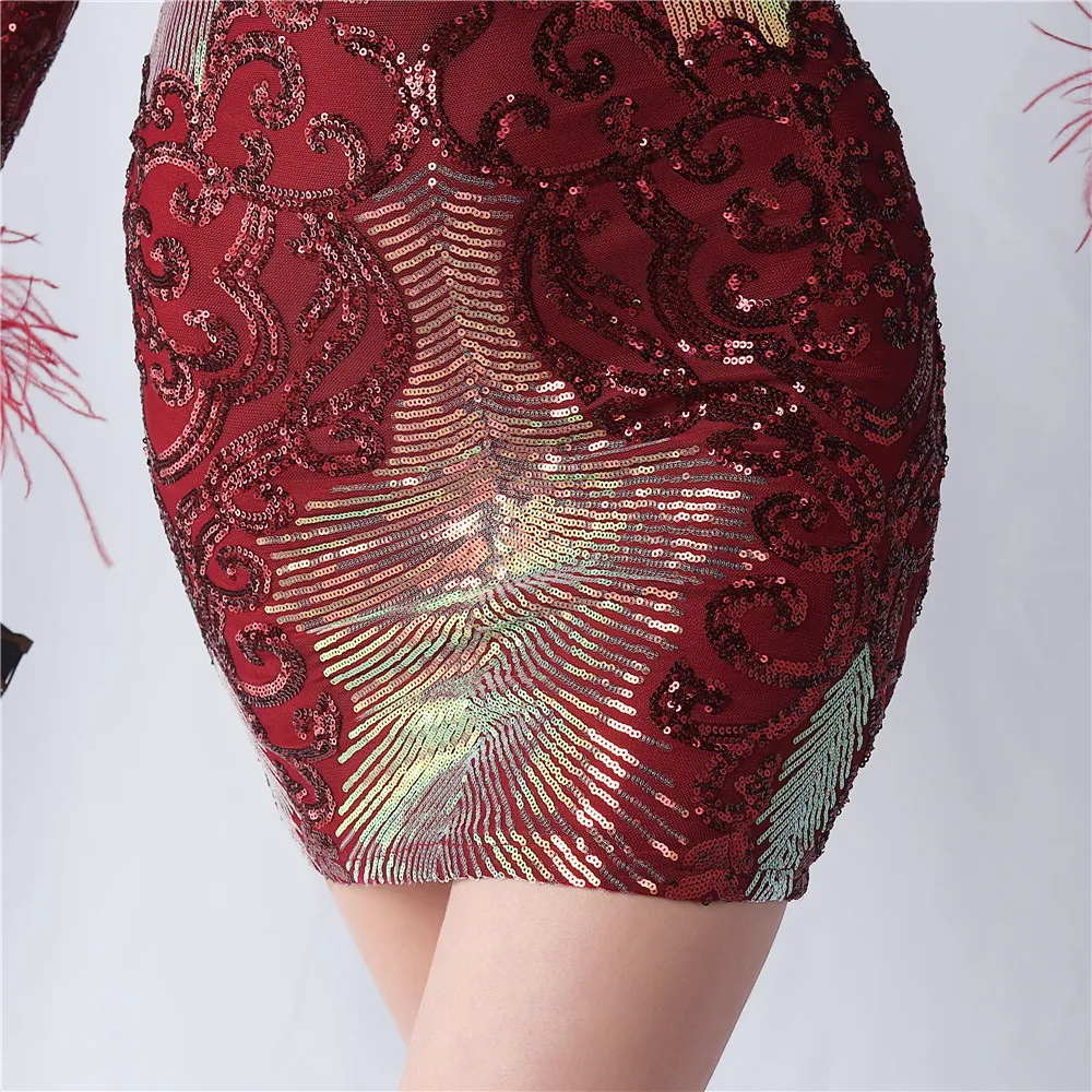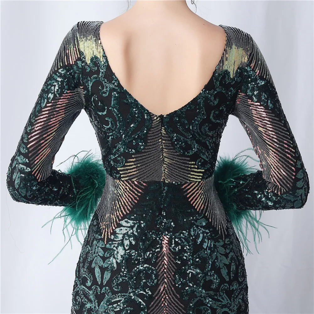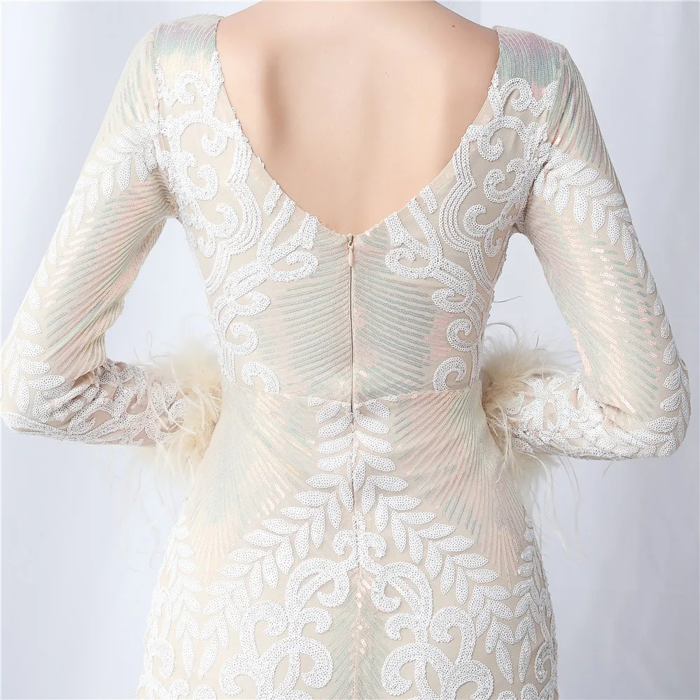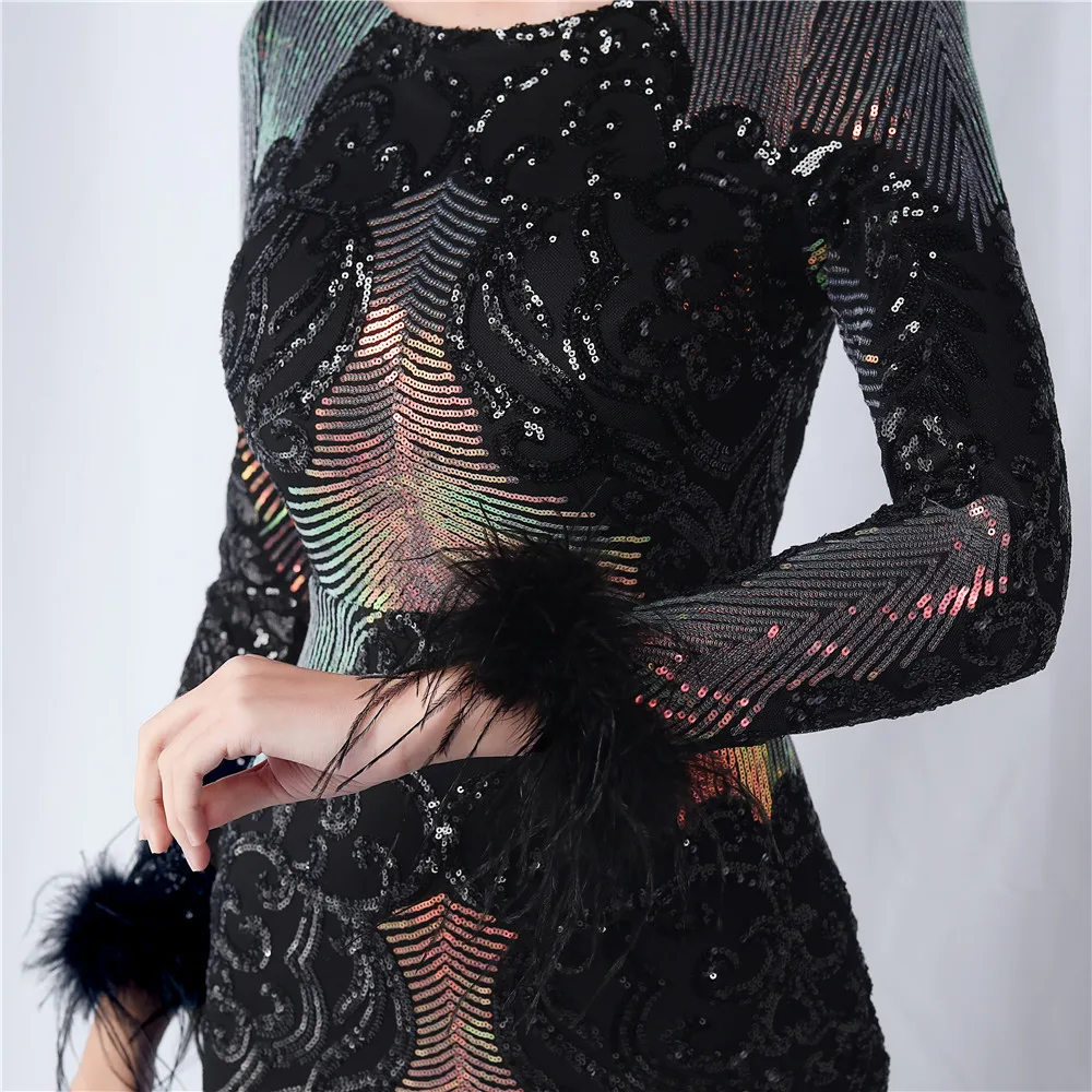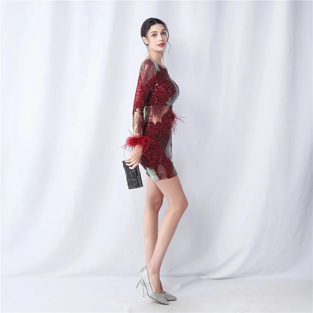 Elegant O-Neck Sequin Short Prom Dress with Long Feather Sleeves