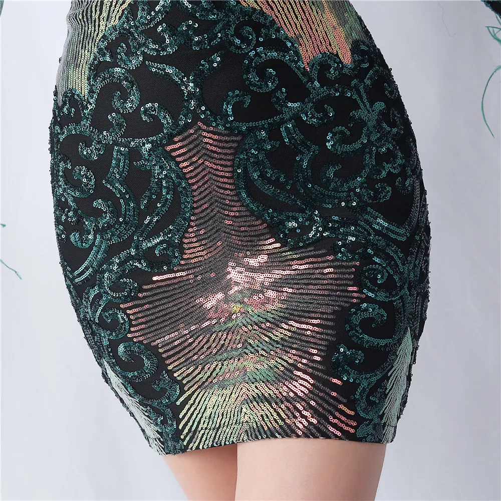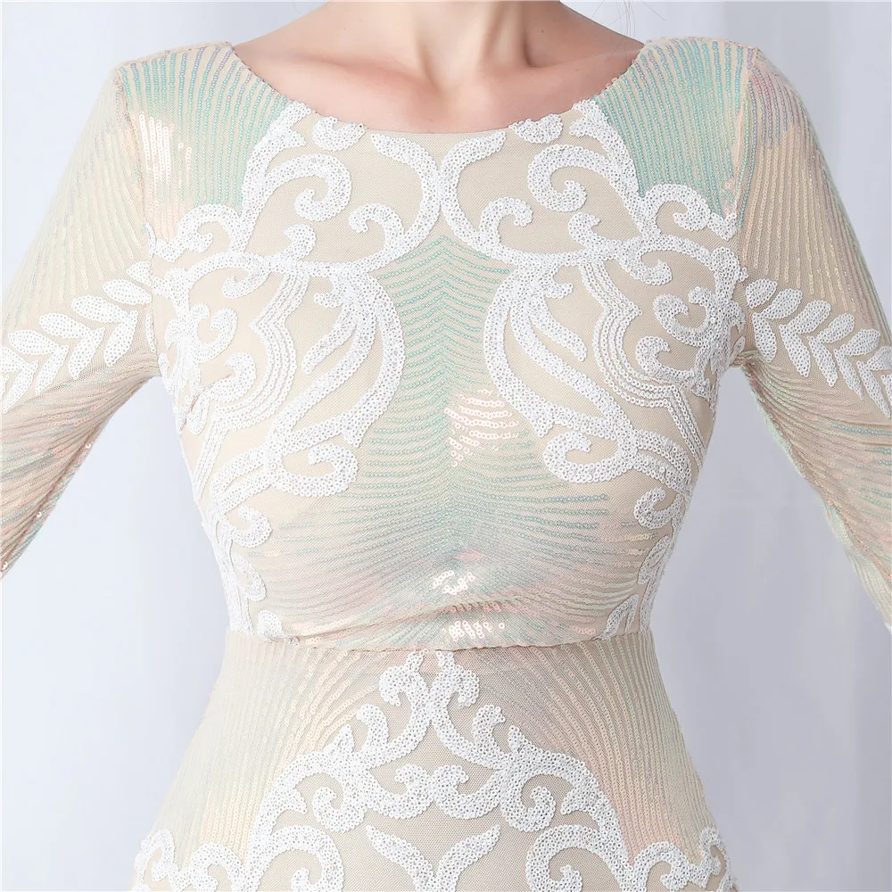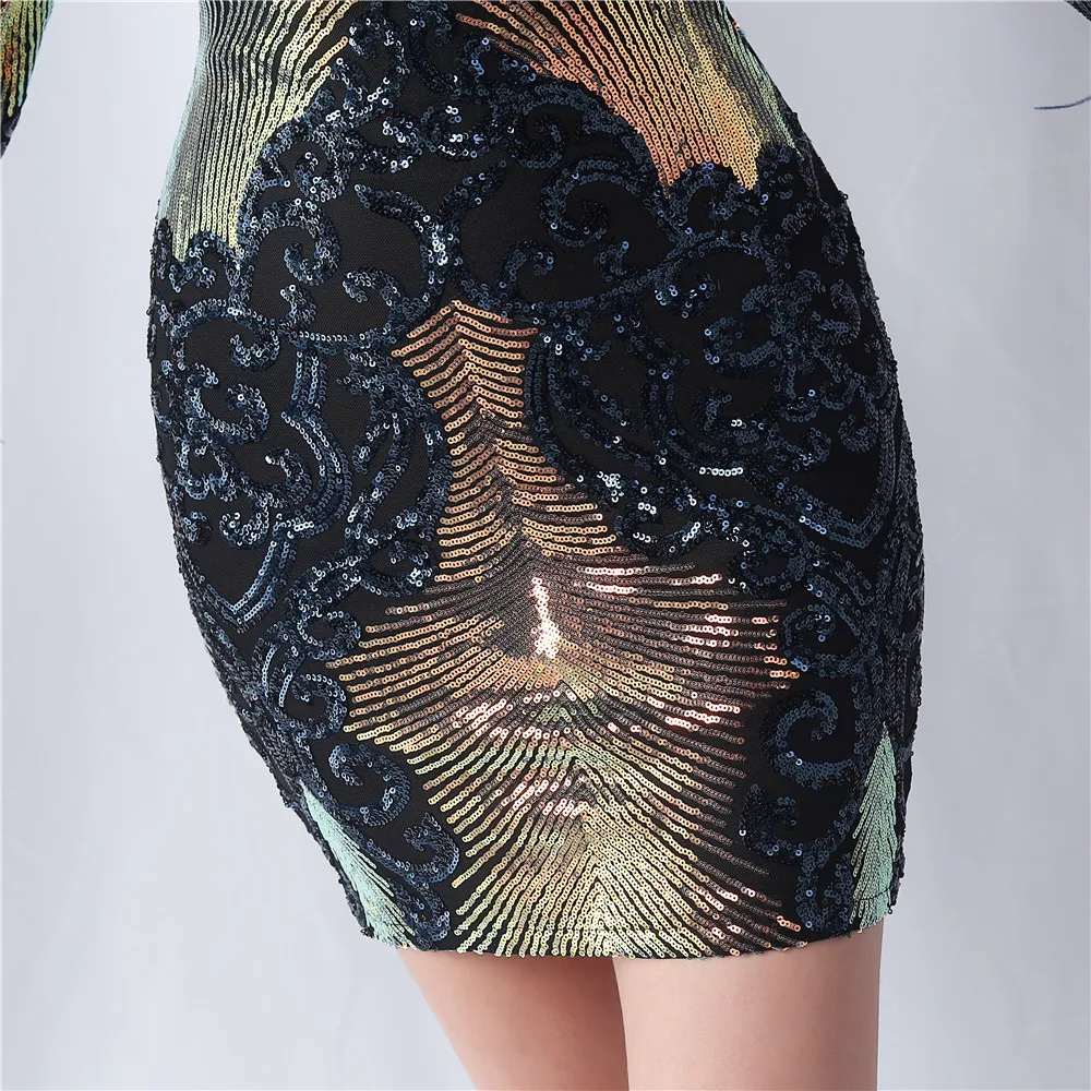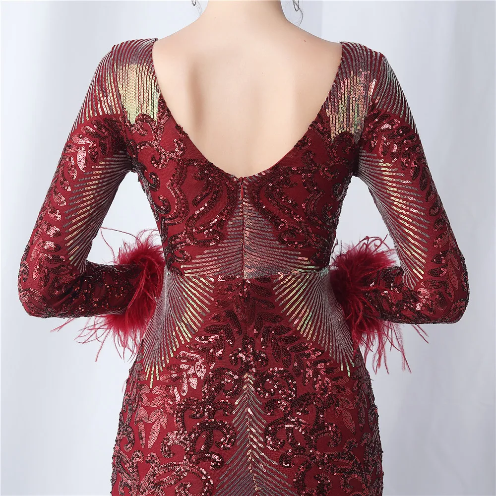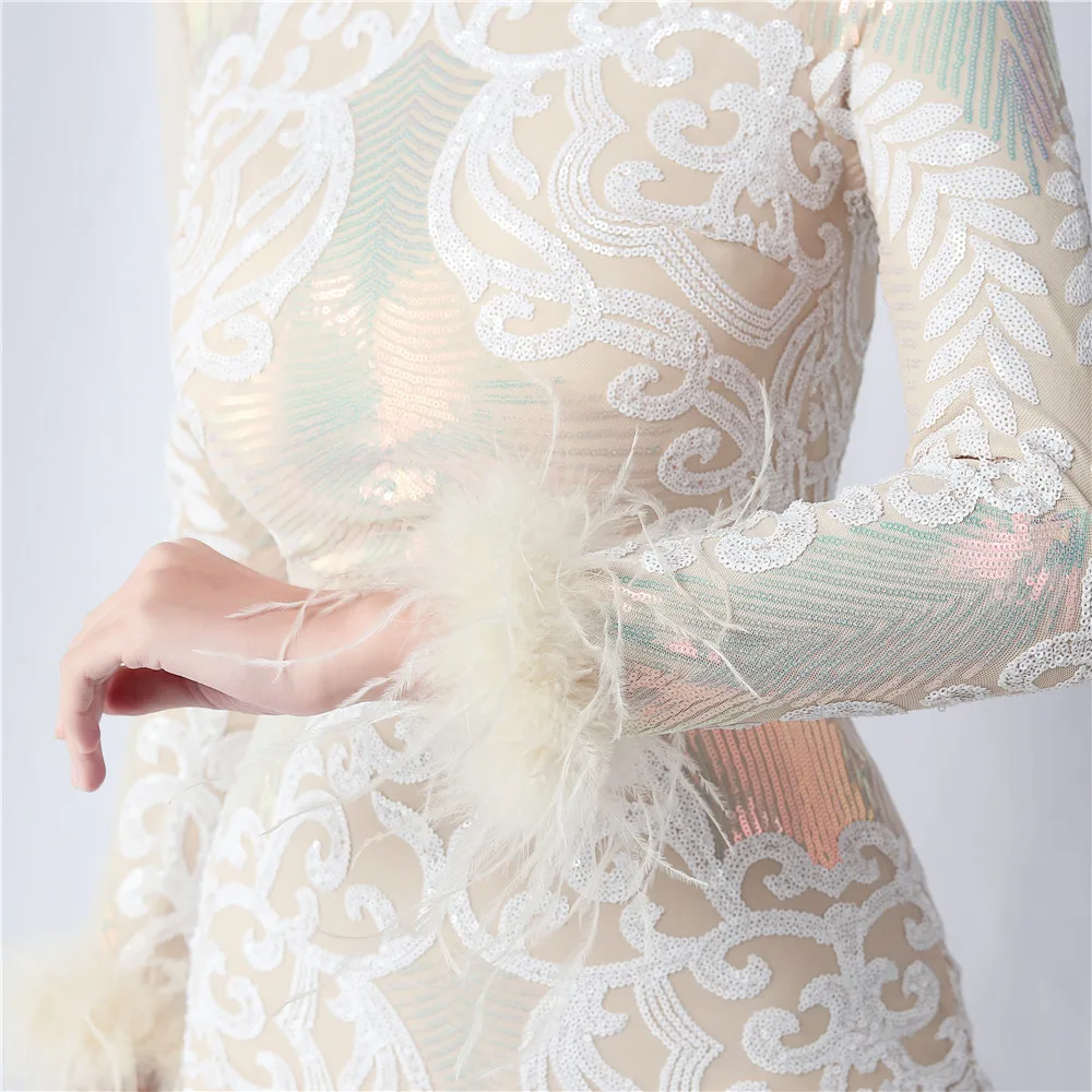Elegant O-Neck Sequin Short Prom Dress with Long Feather Sleeves