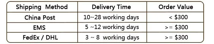 Packages from our warehouse in China will be shipped by ePacket or EMS depending on the weight and size of the product. Packages shipped from our US warehouse are shipped through USPS.