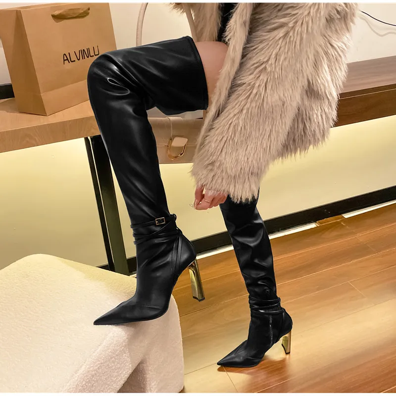 Fashion Autumn Winter Soft Leather Stretch Women Thigh high Boots Elegant Pointed toe High heels Over the knee Boots Party Shoes