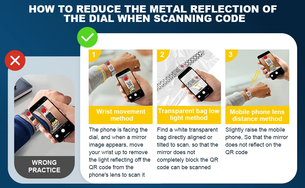 Due to the fact that the dial is a mirror, there will be a mirror image when scanning the code. We suggest that customers see that the 2D code is obstructed by light and shadow. Simply move the wrist up or down to remove the light from the 2D code position, and you can scan directly