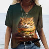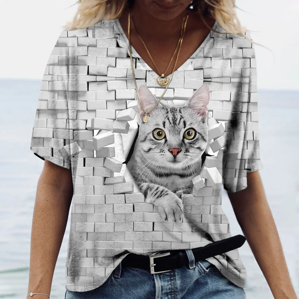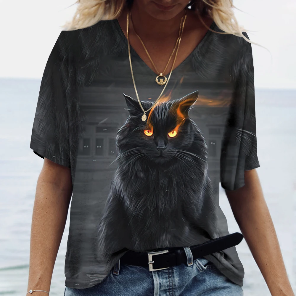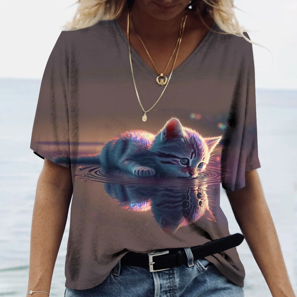 Fashion Women’s T-shirt Cat Printed Short Sleeve Female Harajuku Tees Ladies T Shirt Oversized V-neck Tops Animal Women Clothing