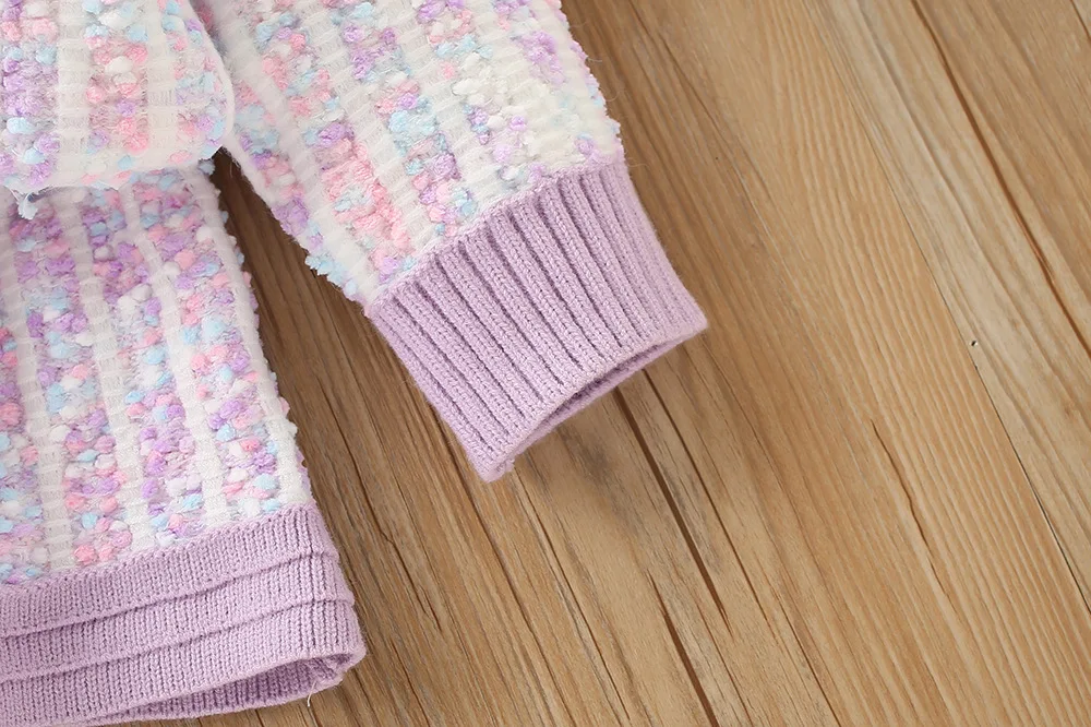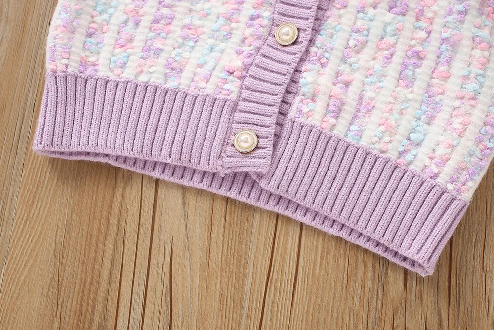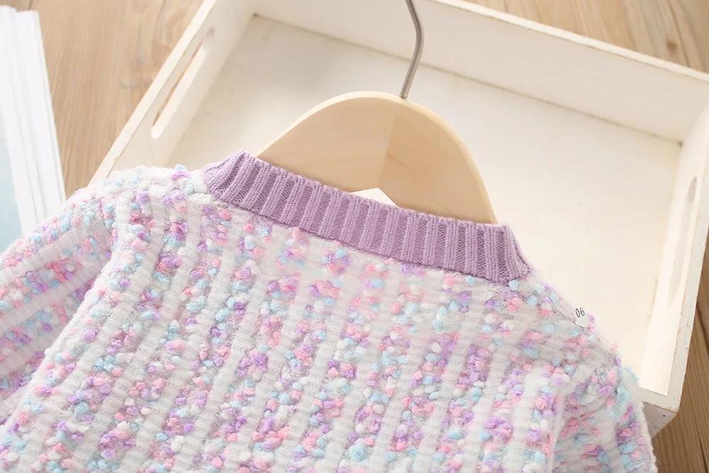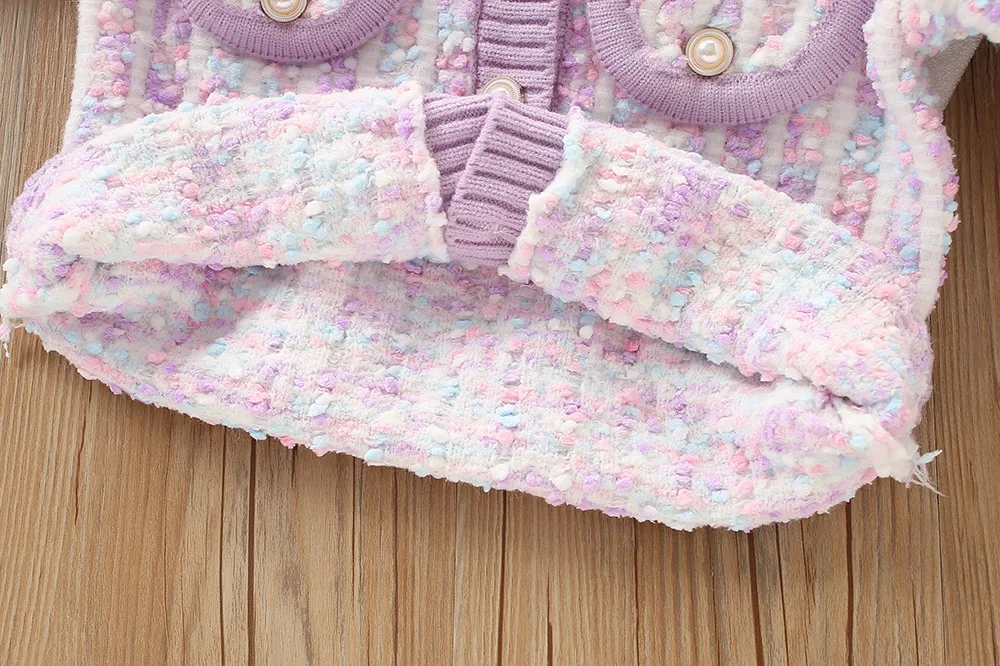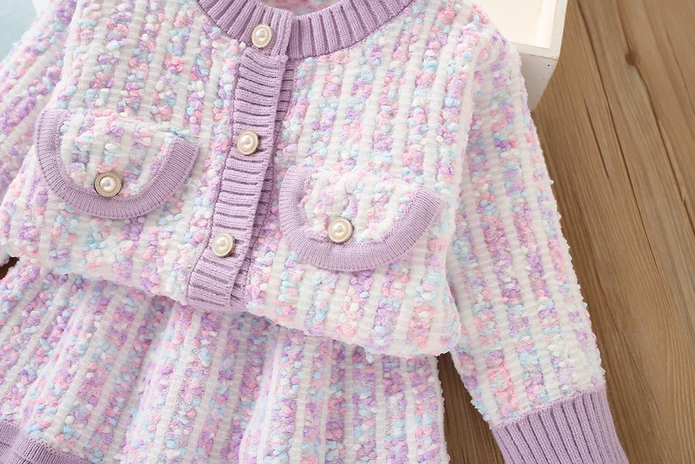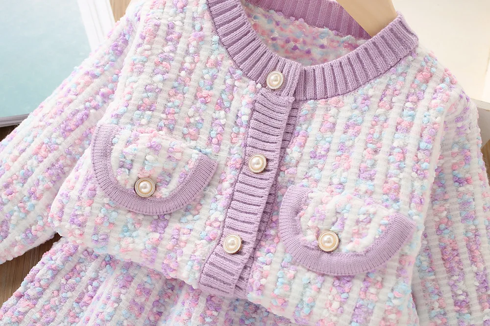 Girls’ Knitted Set 2024 Autumn/Winter New Grain Plush Contrast Color Long sleeved Set Warm cardigan pleated skirt two-piece set