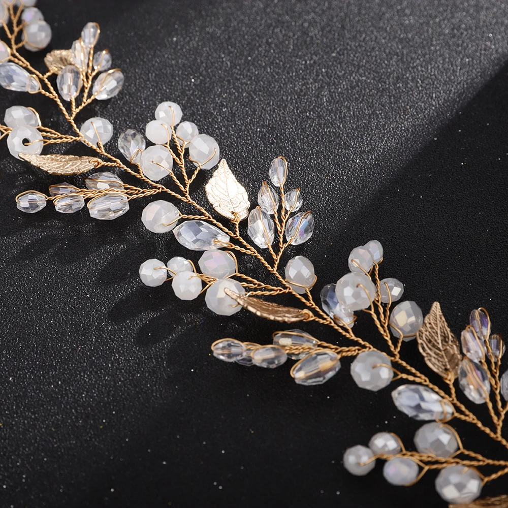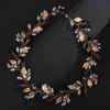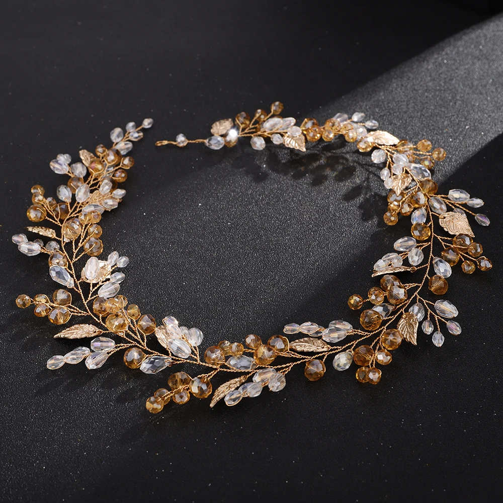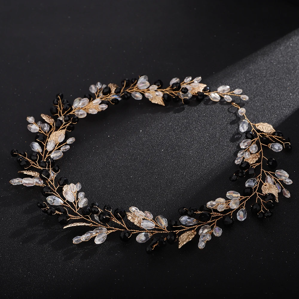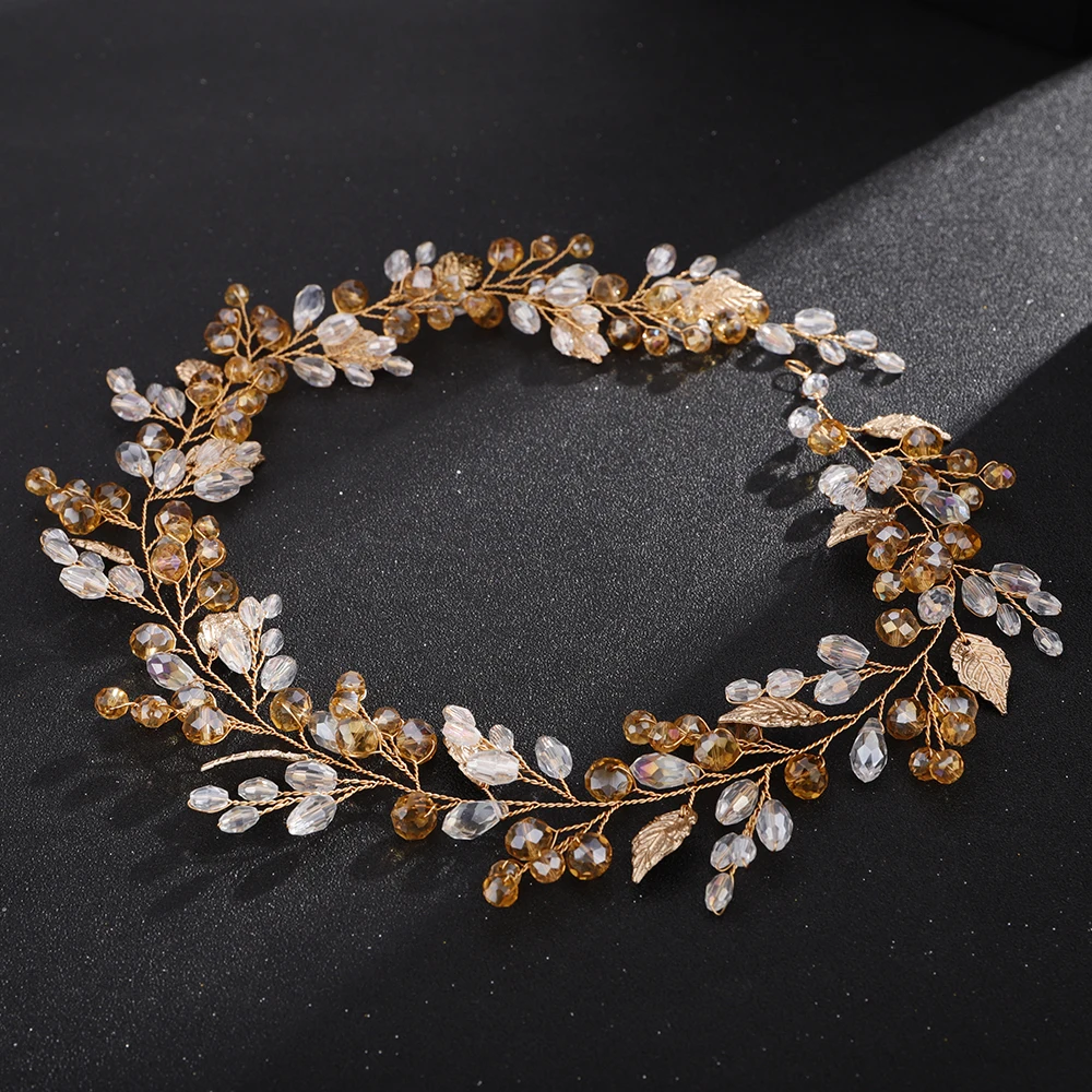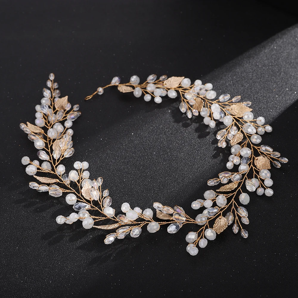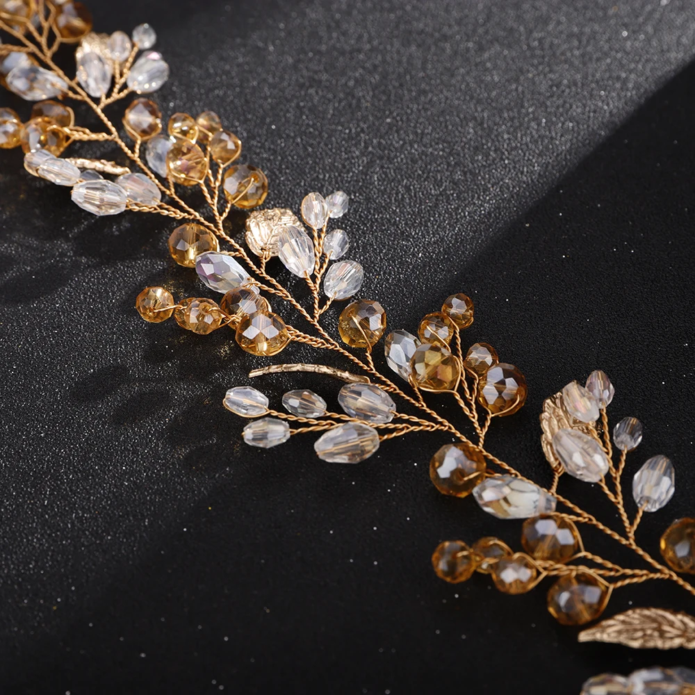 Gold Wedding Headpieces for Bride Handmade Bridal Headband with Leaf Crystal Hair Accessories Hair Vine for Women