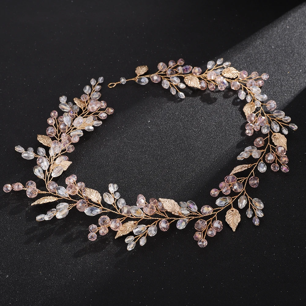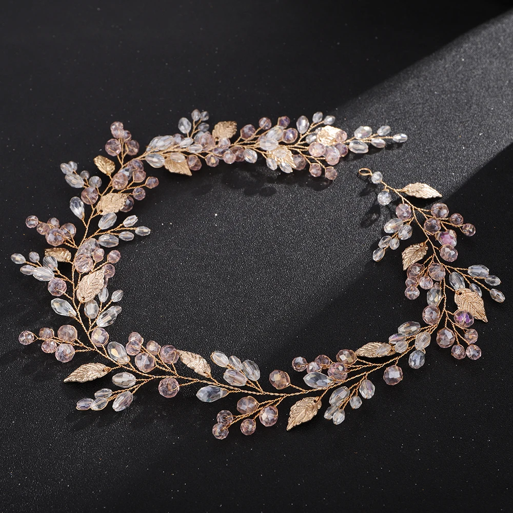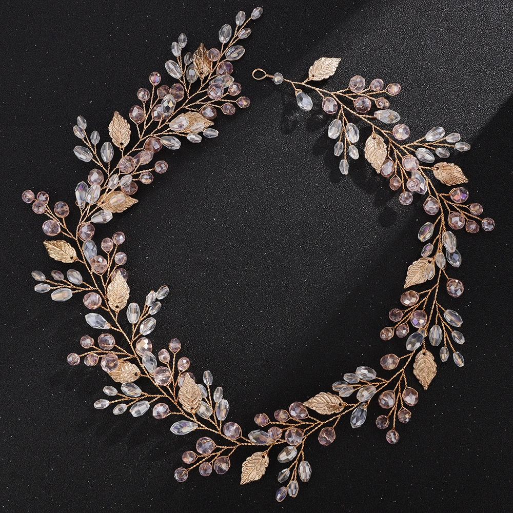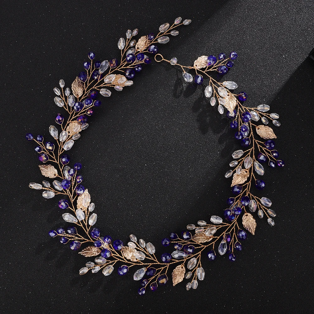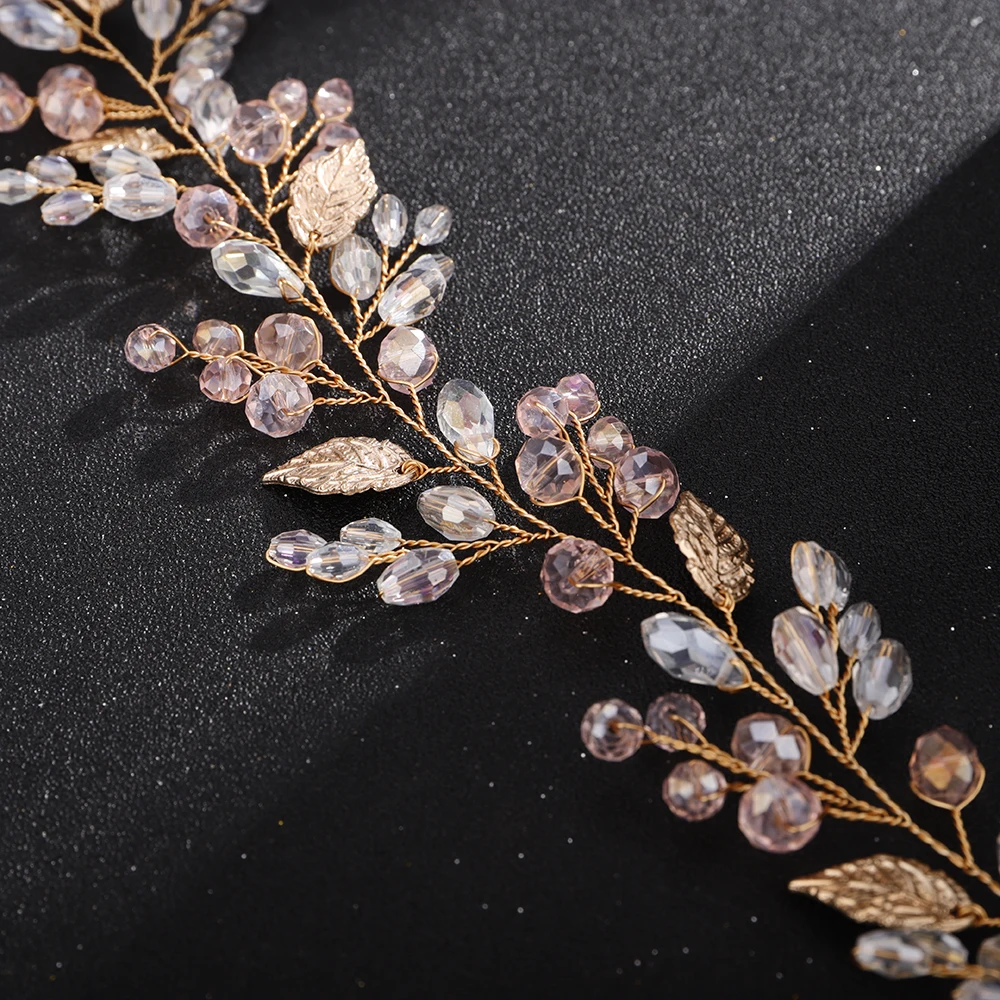 Gold Wedding Headpieces for Bride Handmade Bridal Headband with Leaf Crystal Hair Accessories Hair Vine for Women