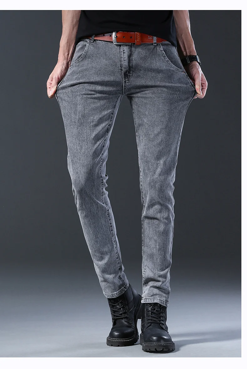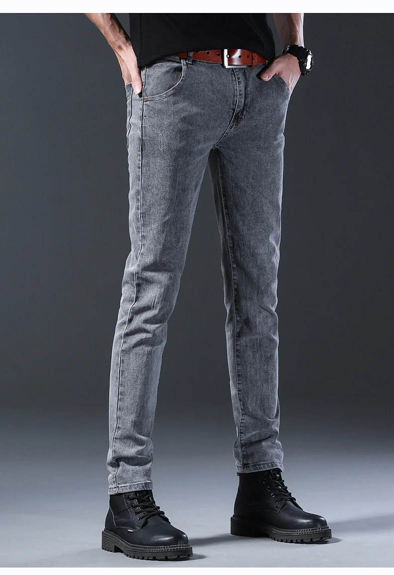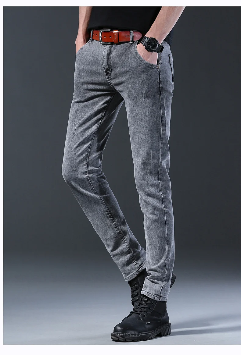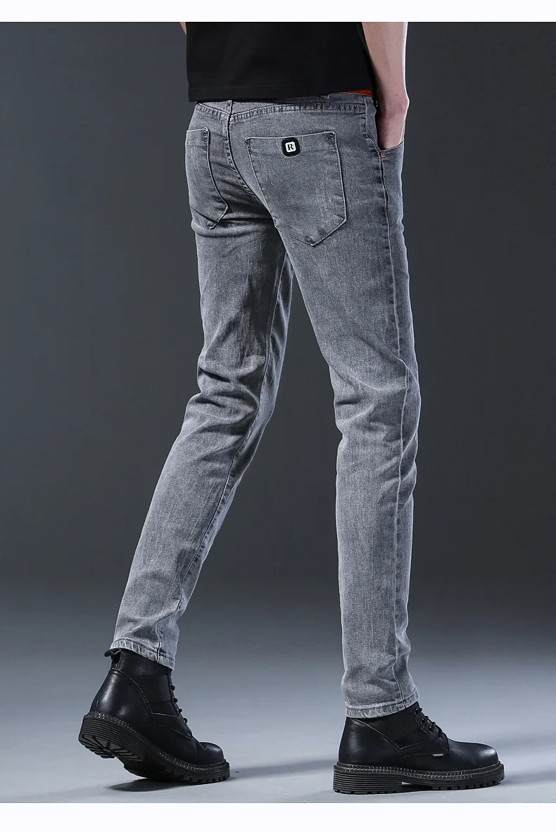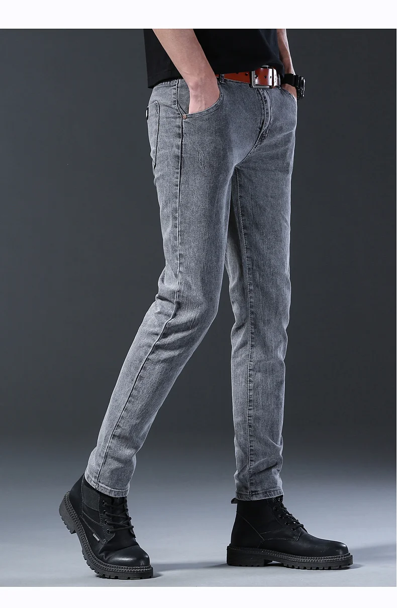 Grey Denim Jeans Male Elastic Pants Fashion Men’s Long Thin High Street Small Feet Trousers
