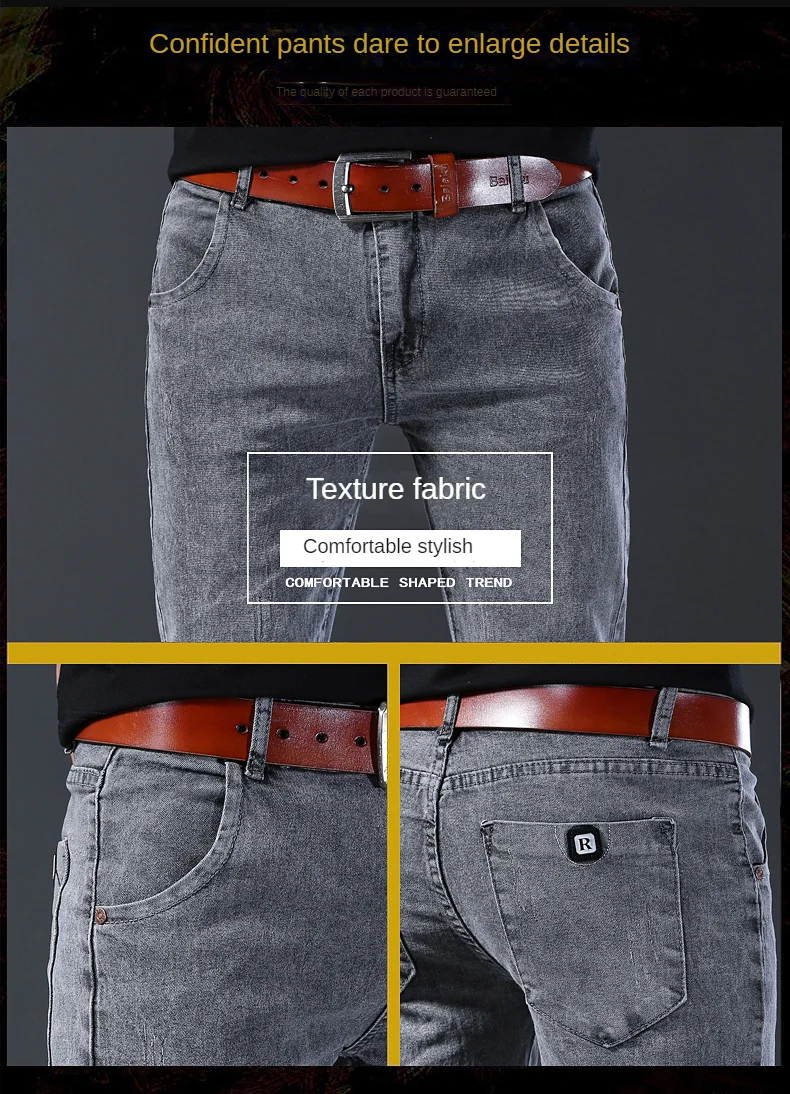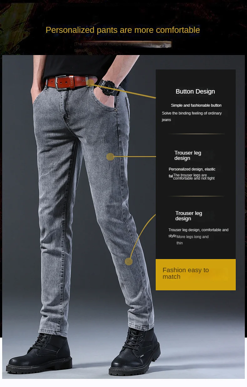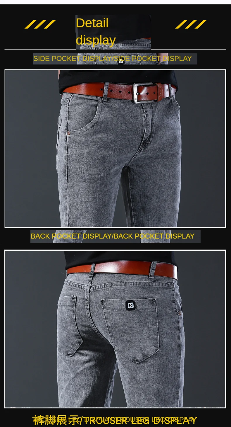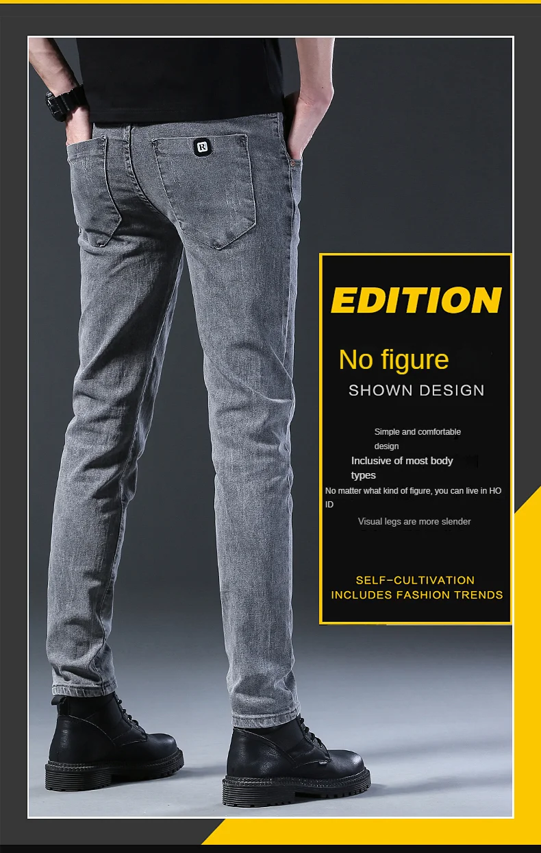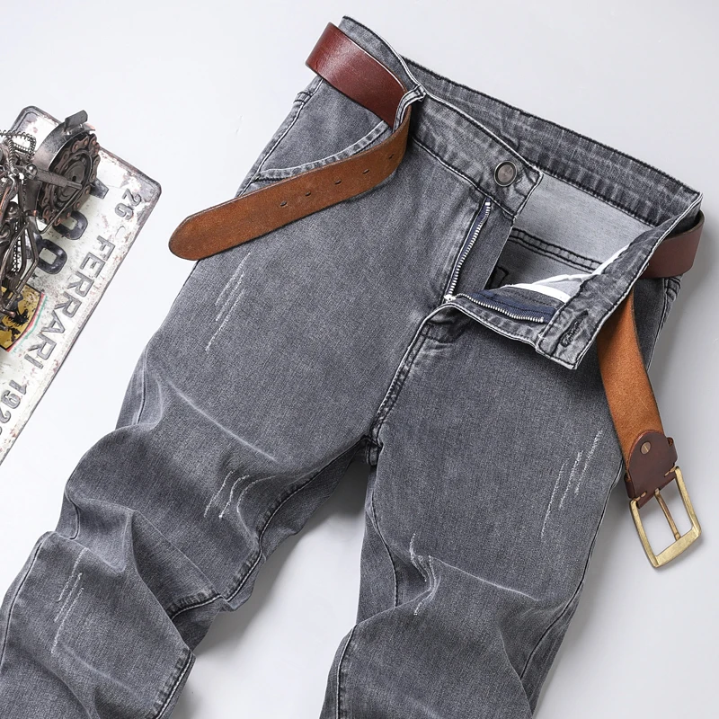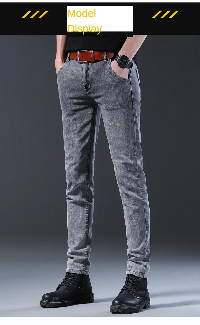 Grey Denim Jeans Male Elastic Pants Fashion Men’s Long Thin High Street Small Feet Trousers