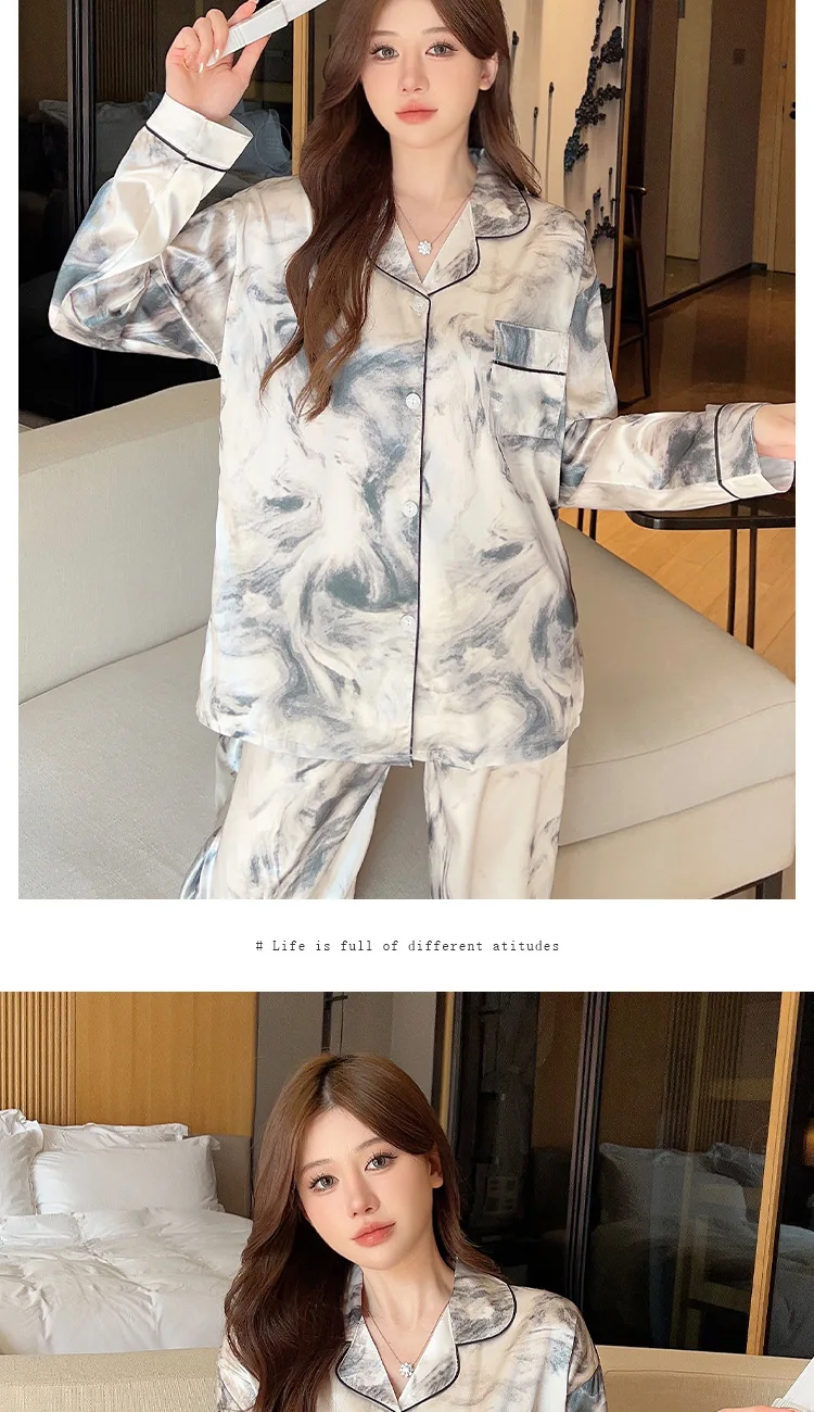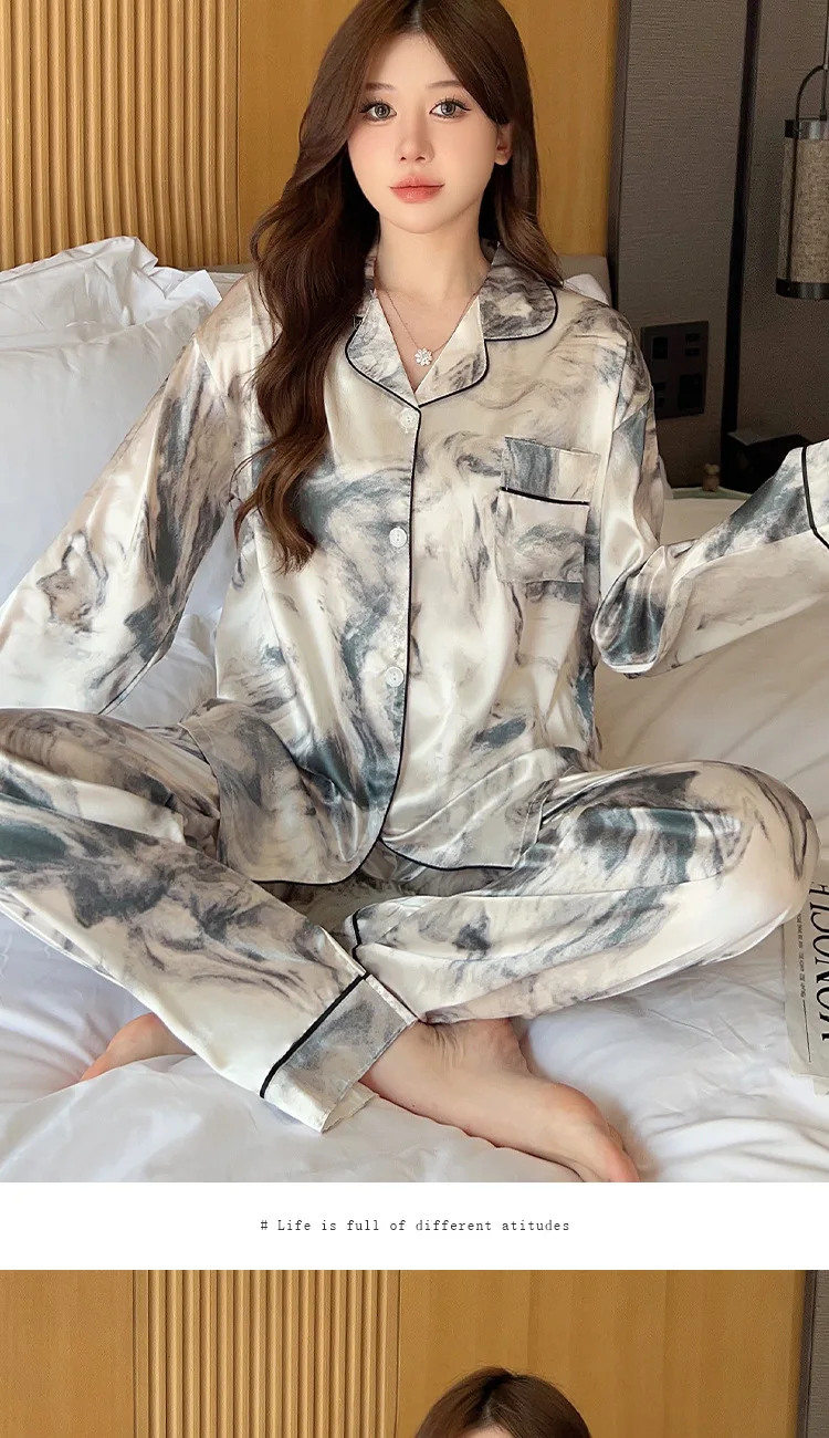 Ink Flower Pajamas Spring Autumn New Long-sleeved Trousers Two-piece Set, Korean Loungewear Satin Silk Luxury Loungewear Women