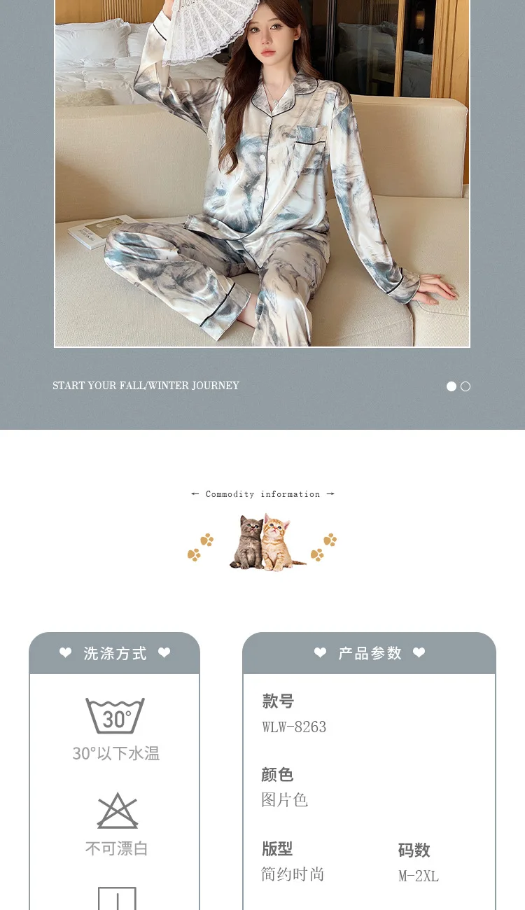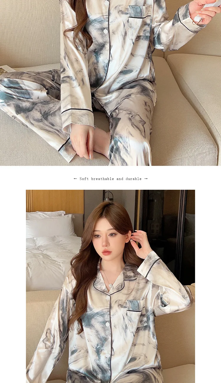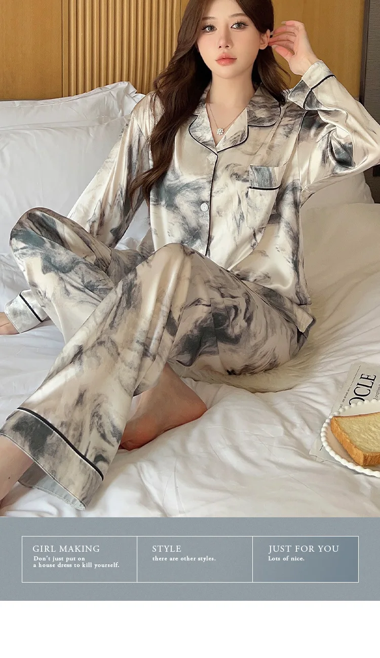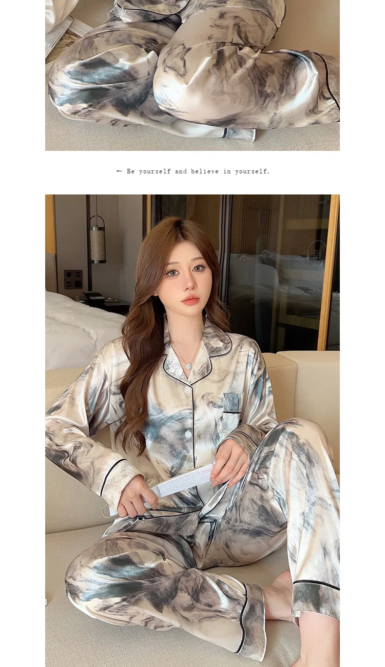 Ink Flower Pajamas Spring Autumn New Long-sleeved Trousers Two-piece Set, Korean Loungewear Satin Silk Luxury Loungewear Women