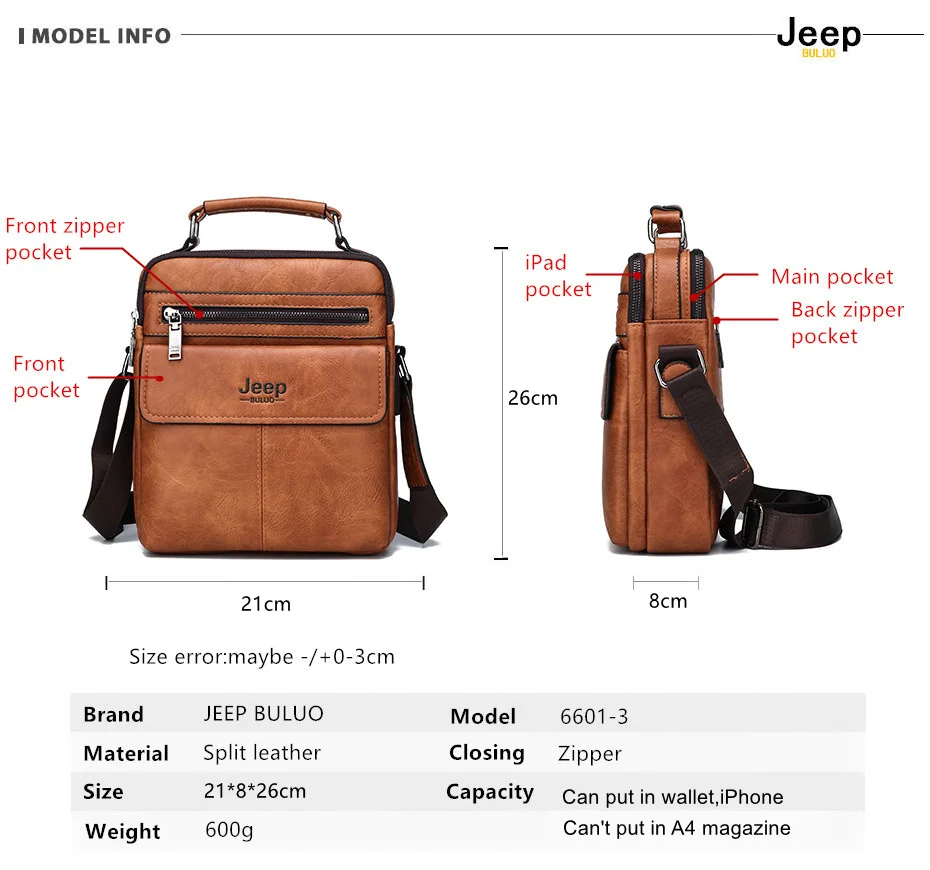 JEEP BULUO Men’s Crossbody Shoulder Bags Split Leather Handbag Fashion Business Man Messenger Bag High quality Tote Hot