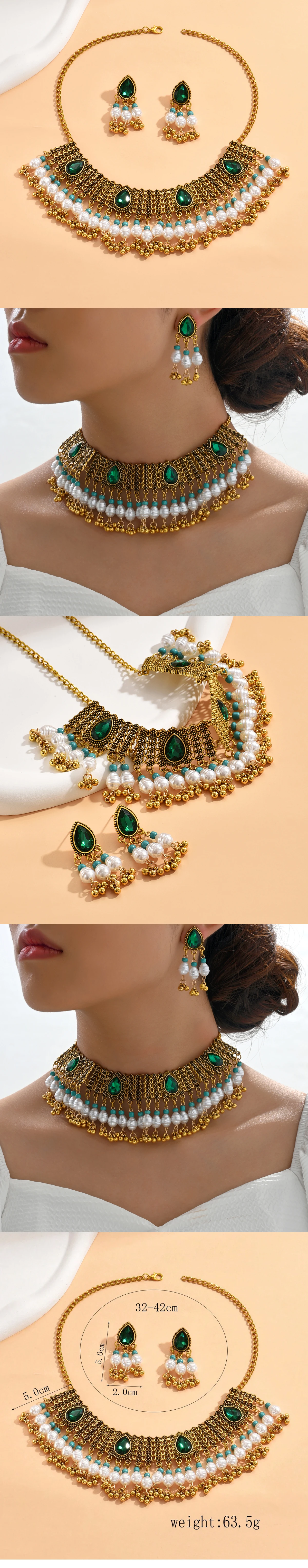 Kymyad Vintage Jewelry For Woman Green Crystal Stone Jewelry Sets Simulated Pearl Beads Necklace Earrings Set For Women