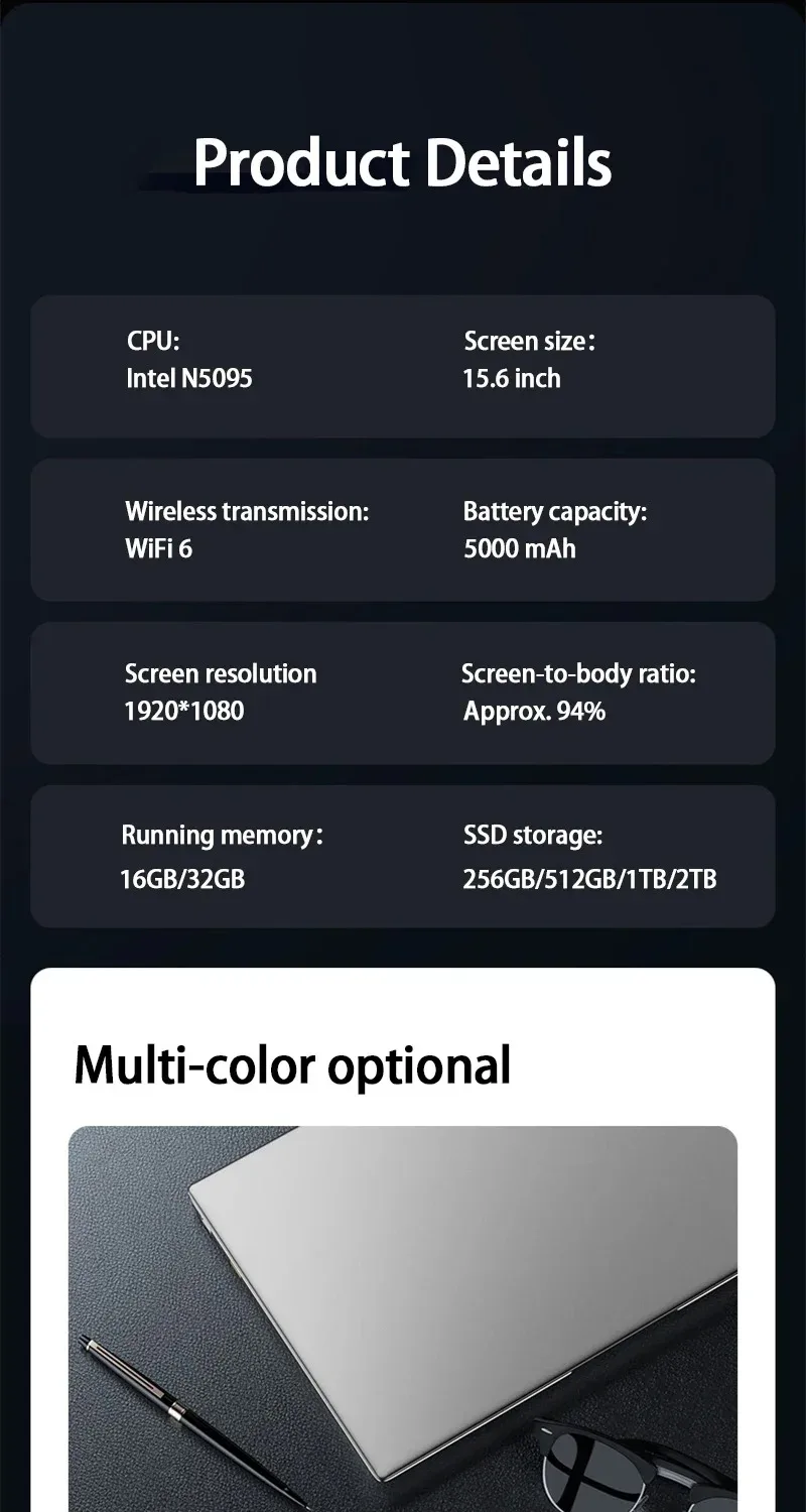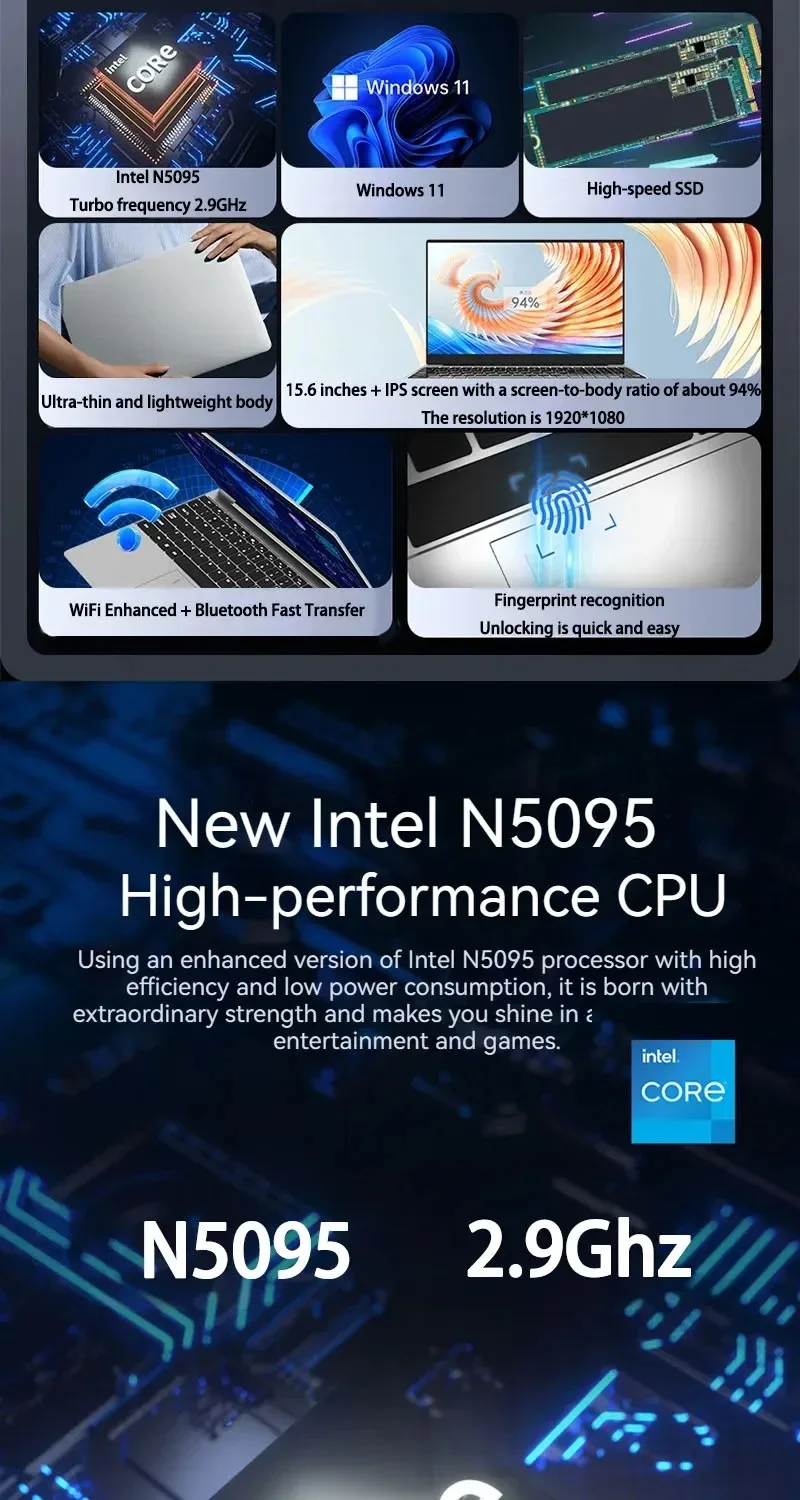 Laptop Computer 15.6 Inch CPU Intel N5095 16GB RAM 1TB WiFi6 Lightweight Business Computer Notebook Windows 11 Gaming laptops