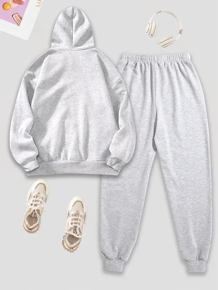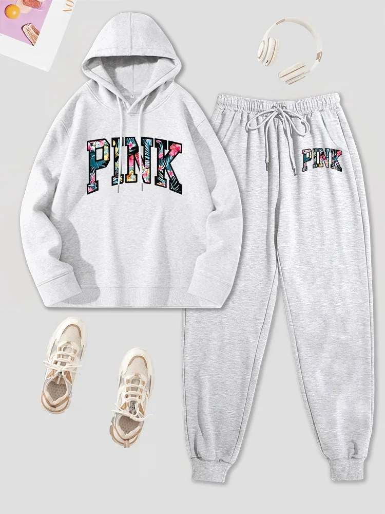 Letter Print two-piece set, drawstring hoodie and casual lace up waist jogging pants, women’s clothing