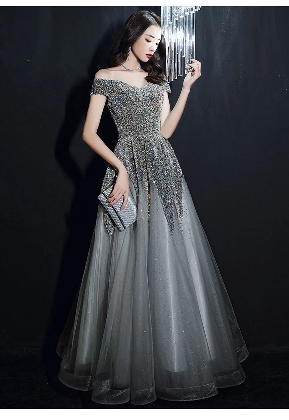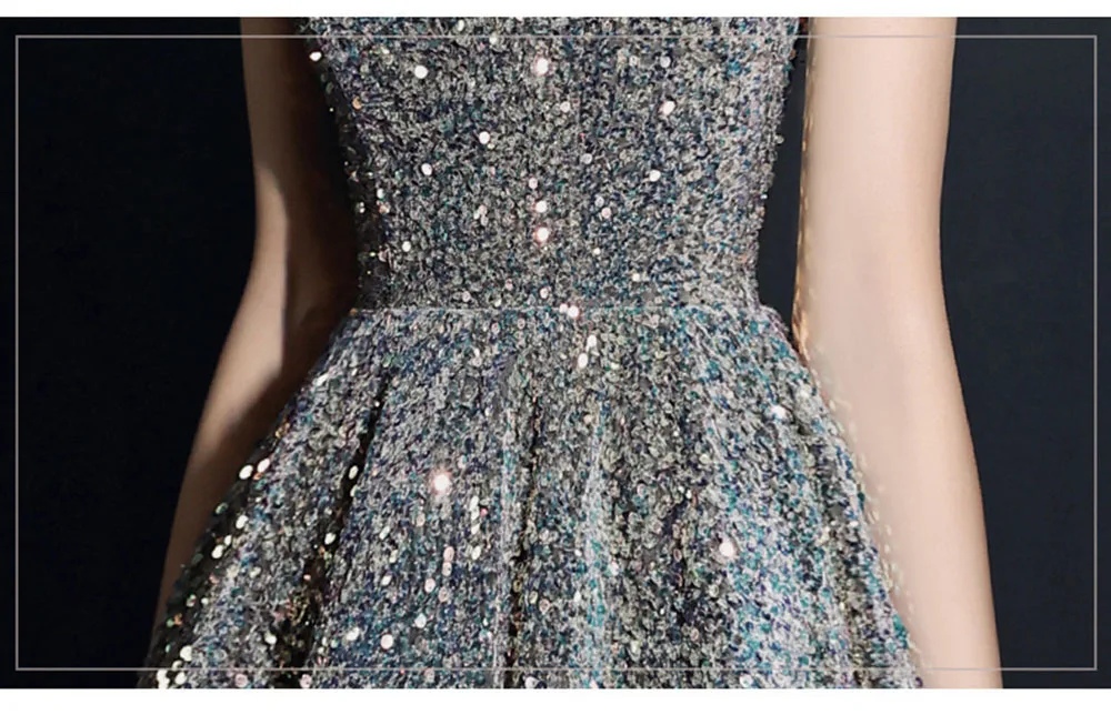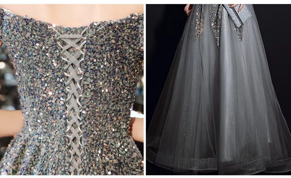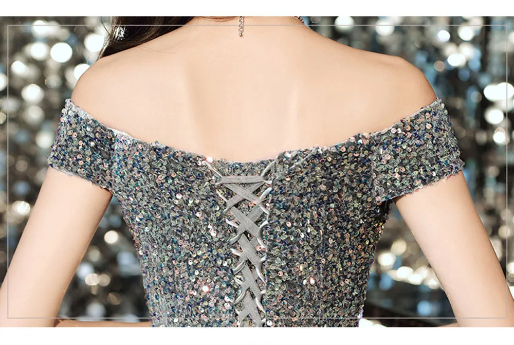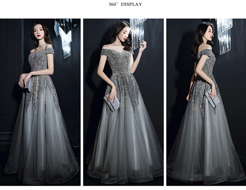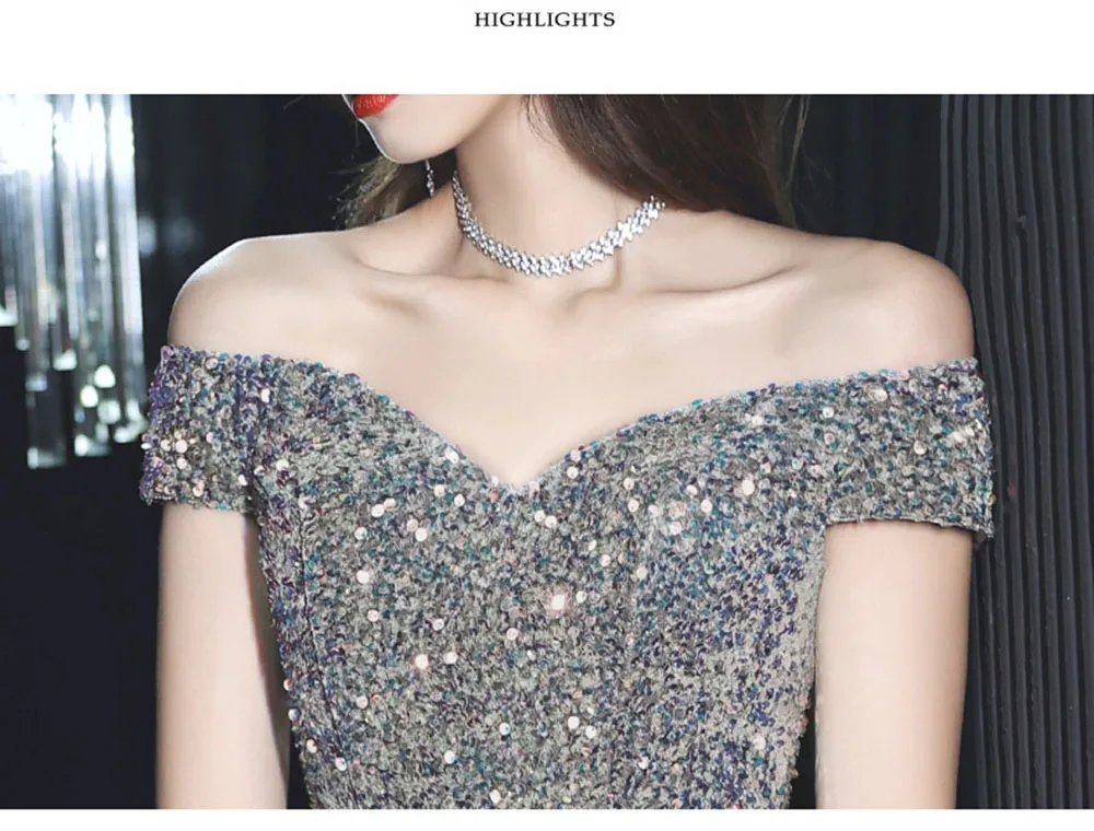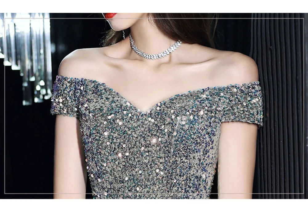 Light Luxury Sequin Evening Dress Women’s Elegant Off Shoulder Design Floor Length A-Line Prom Gown Irregular Skirt Hem Vestido
