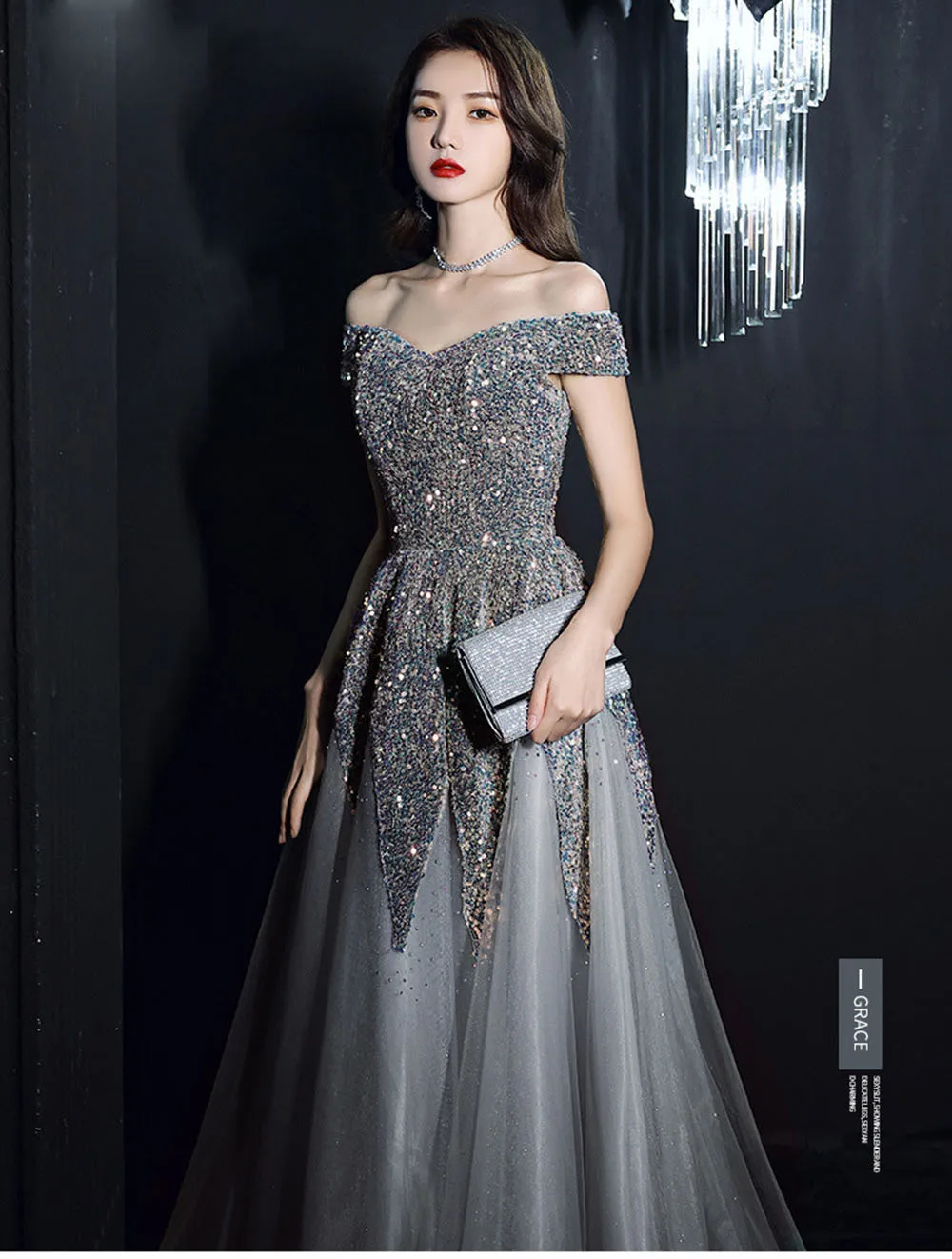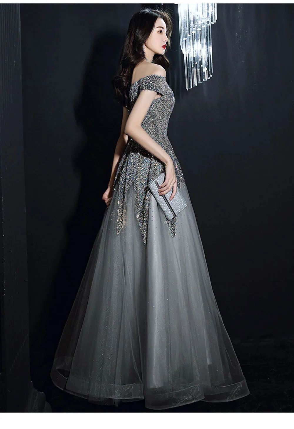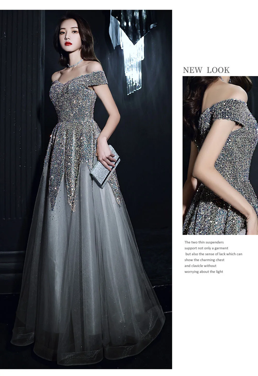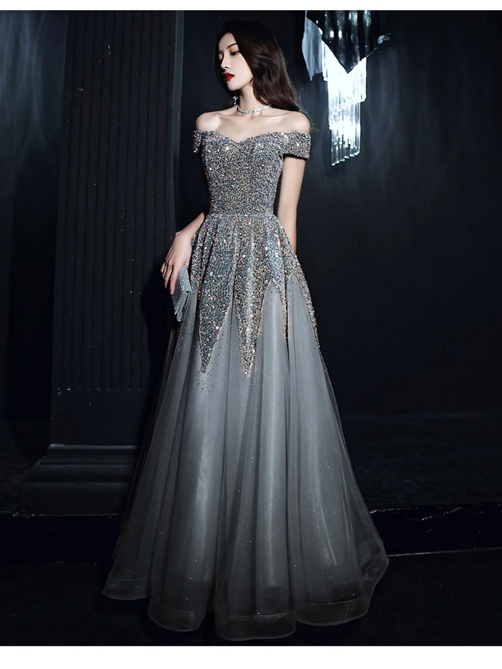 Light Luxury Sequin Evening Dress Women’s Elegant Off Shoulder Design Floor Length A-Line Prom Gown Irregular Skirt Hem Vestido