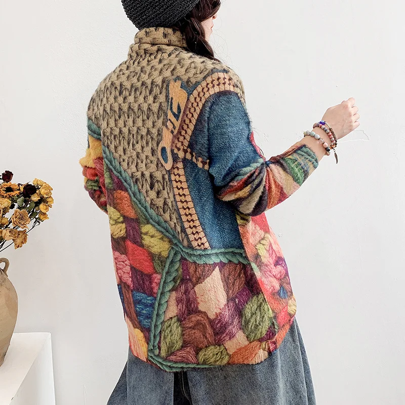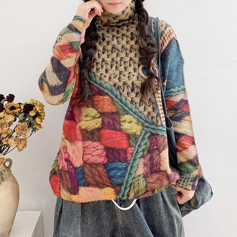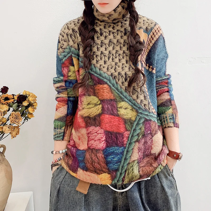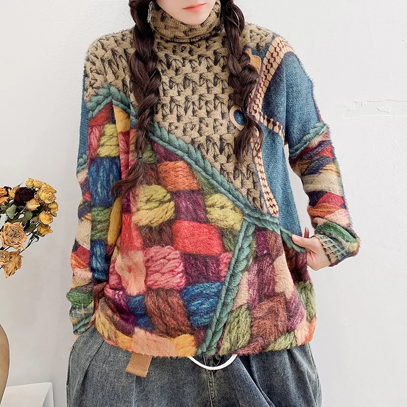 Max LuLu New Fashion Womens Vintage Print Jumpers 2021 Winter European Style Loose Turtleneck Sweaters Casual Elegant Pullovers