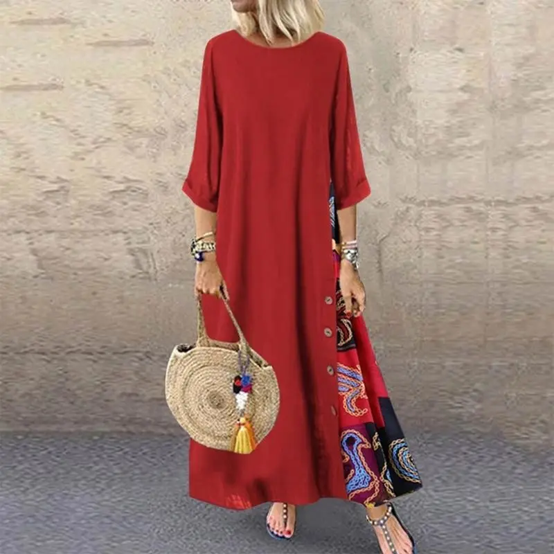 Maxi Dress For Women Elegant Chic Long Dresses Vintage Print Black Red Dress Mid Sleeve Casual O-Neck Streetwear Clothing Ladies