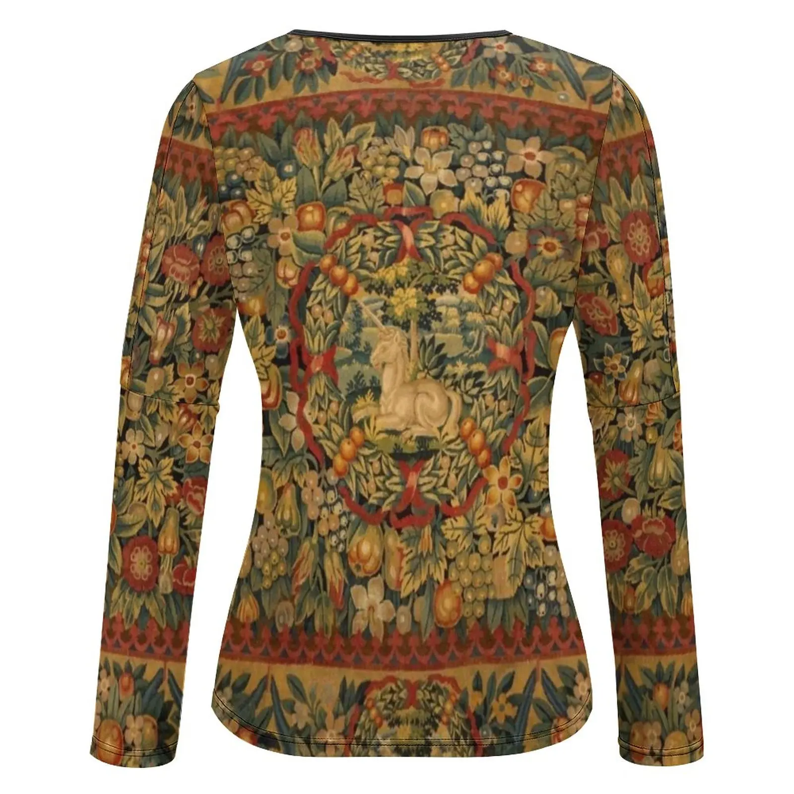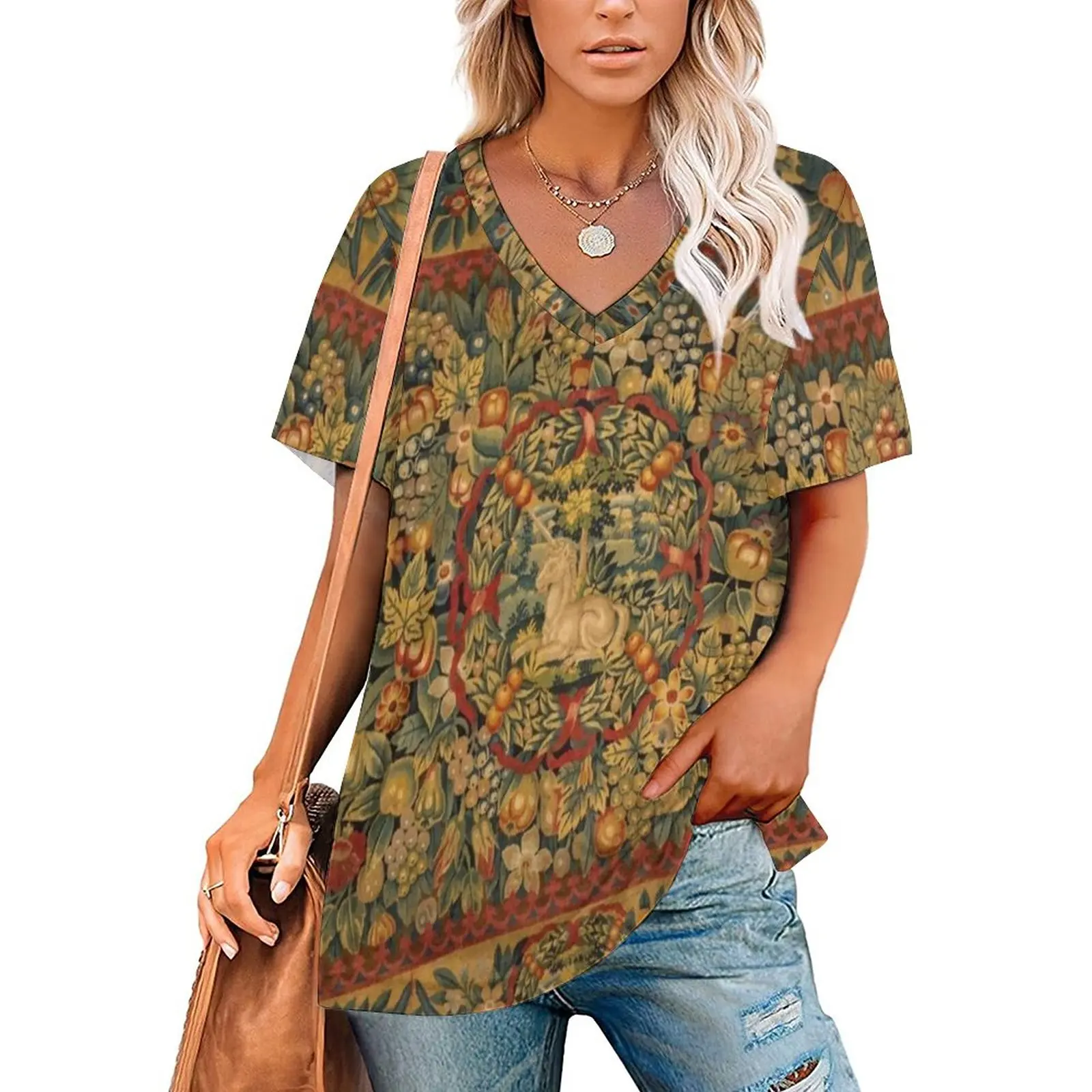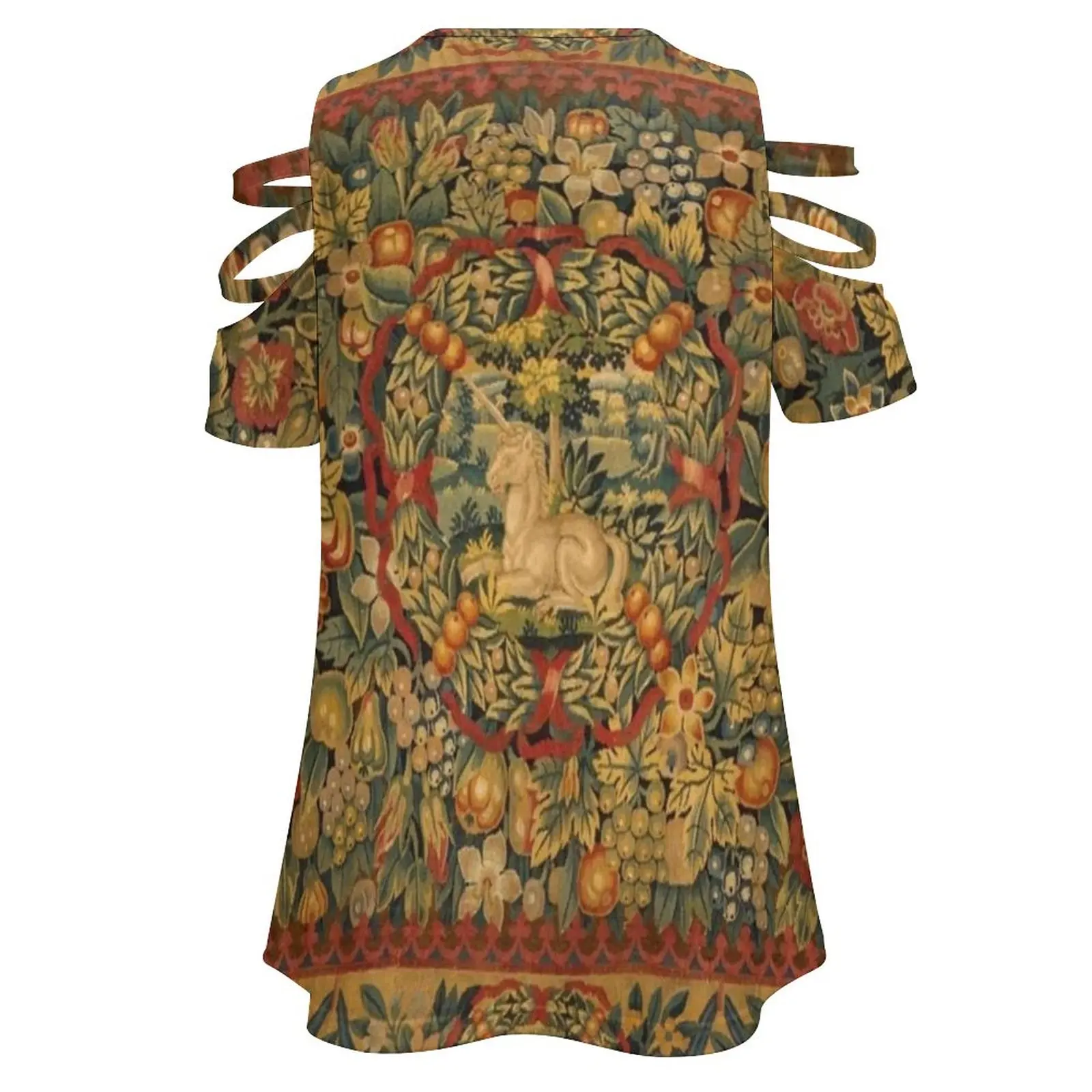 Medieval Unicorn Floral Tapestry Women’s T-Shirt Summer Fashion Print Floral V-Neck Zipper Tshirt Hollow Pullover Ladies Top