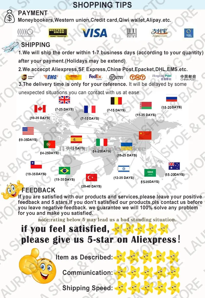 About return and refund:If you want to return or exchange the product,please contact with us within 7 days after you receive the shoes (based on the sign date of the logistic).The product must be in their original status(The shipping and handling charge is not refunded).Human made defect is not gurantee,such as broken,scratched and so on.If the shoes have been weared, we don’t agree return and refund. wish you can understand, thanks.