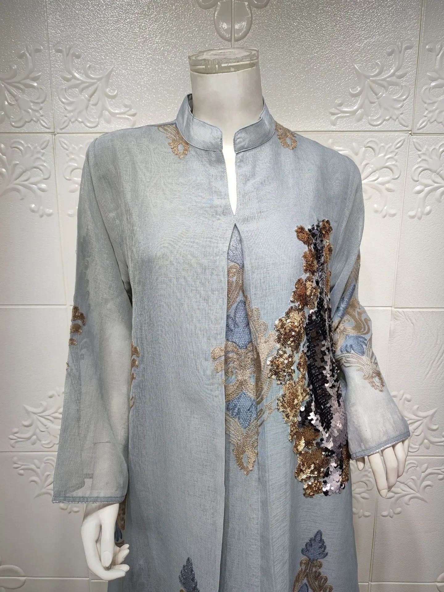 Mesh Sequins Embroidered Abaya Dress For Women Muslim Dubai Evening Party Robe Moroccan Kaftan Turkey Arabic Jalabiya Grey 2021