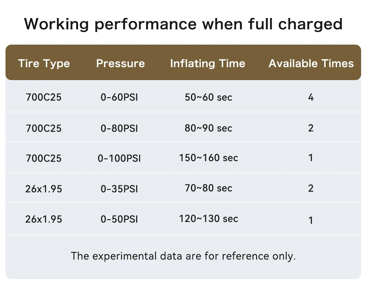 • 100psi :Can inflate tires up to 100psi, ensuring proper inflation for a smooth ride.