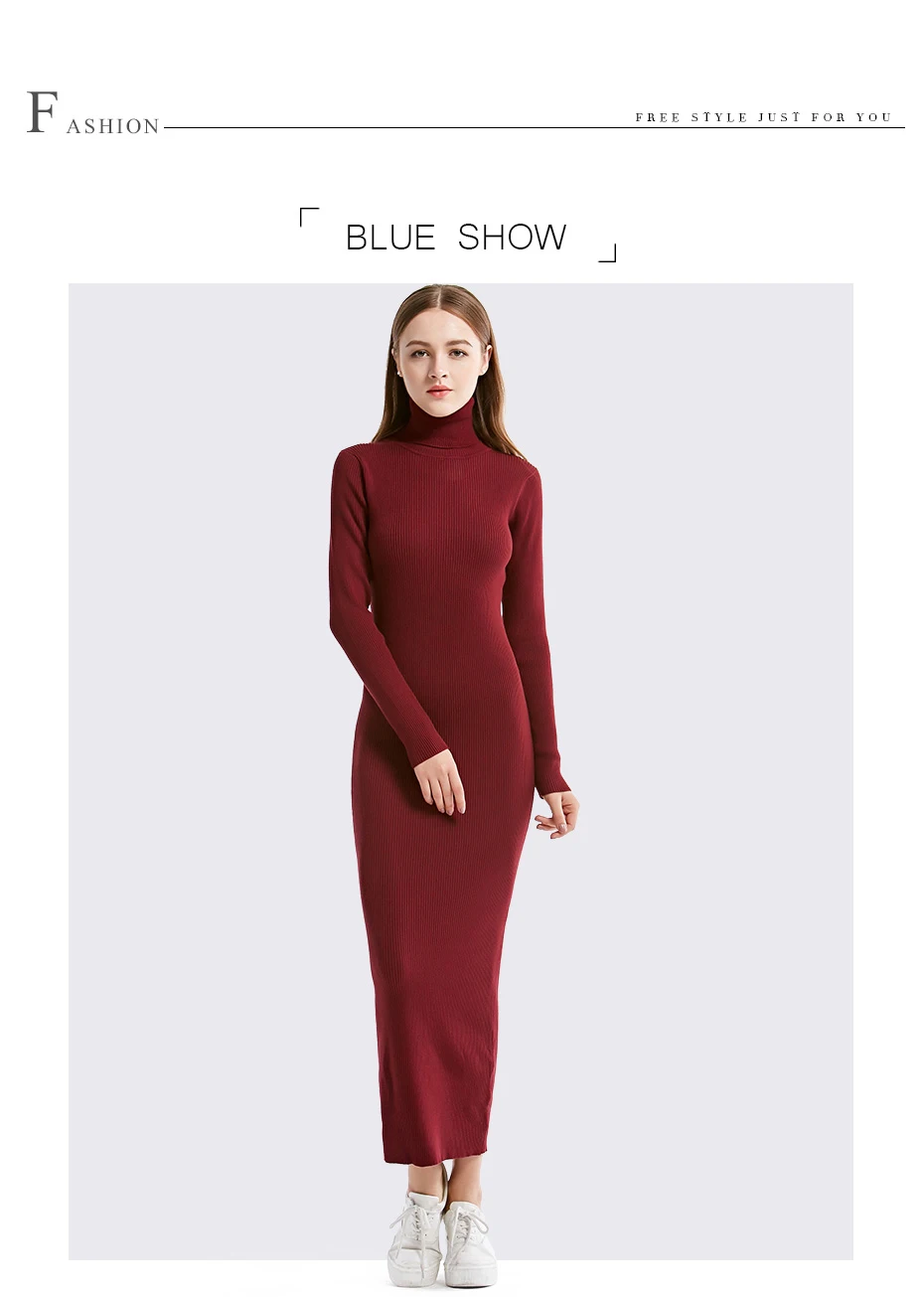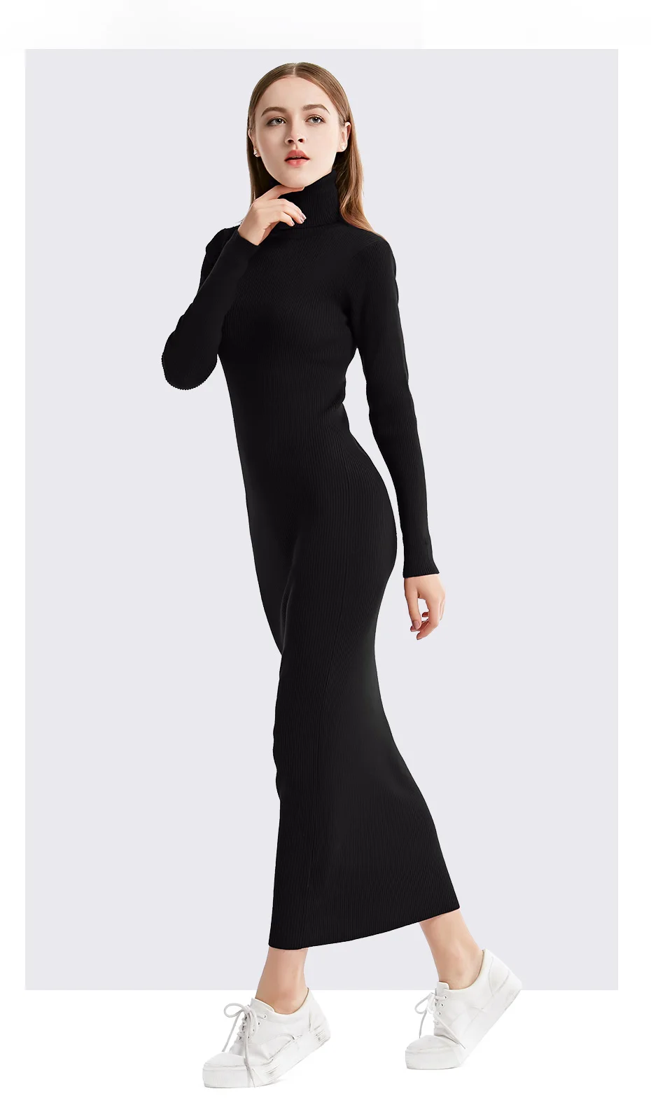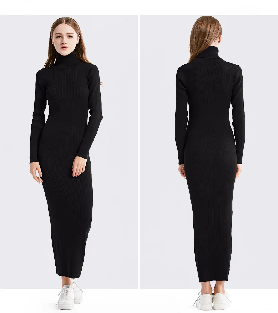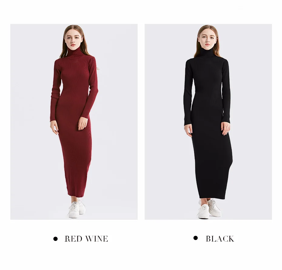 New Fashion Women Sexy Party Dress Knit Style Long Sleeve Turtleneck Winter Maxi Dress Slim Work Wear Office Dress Vestidos