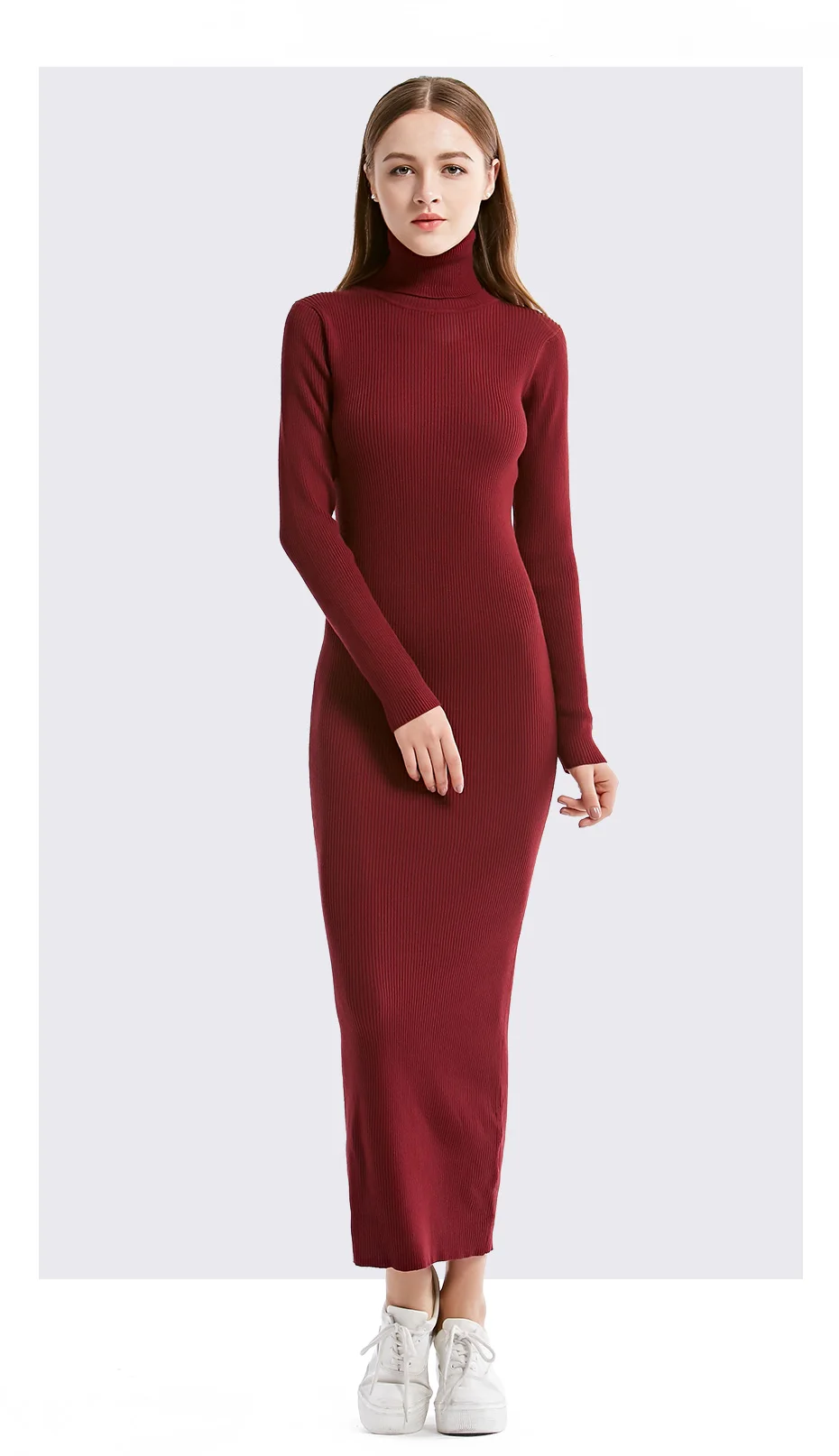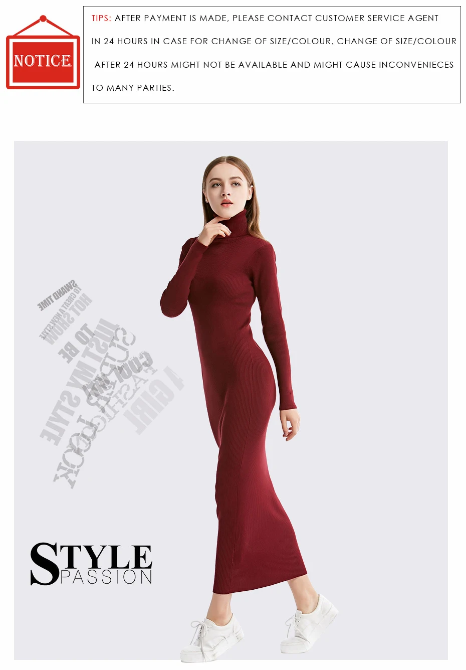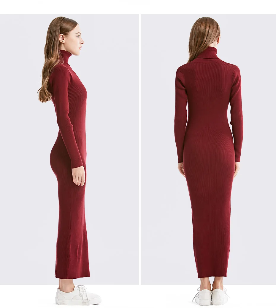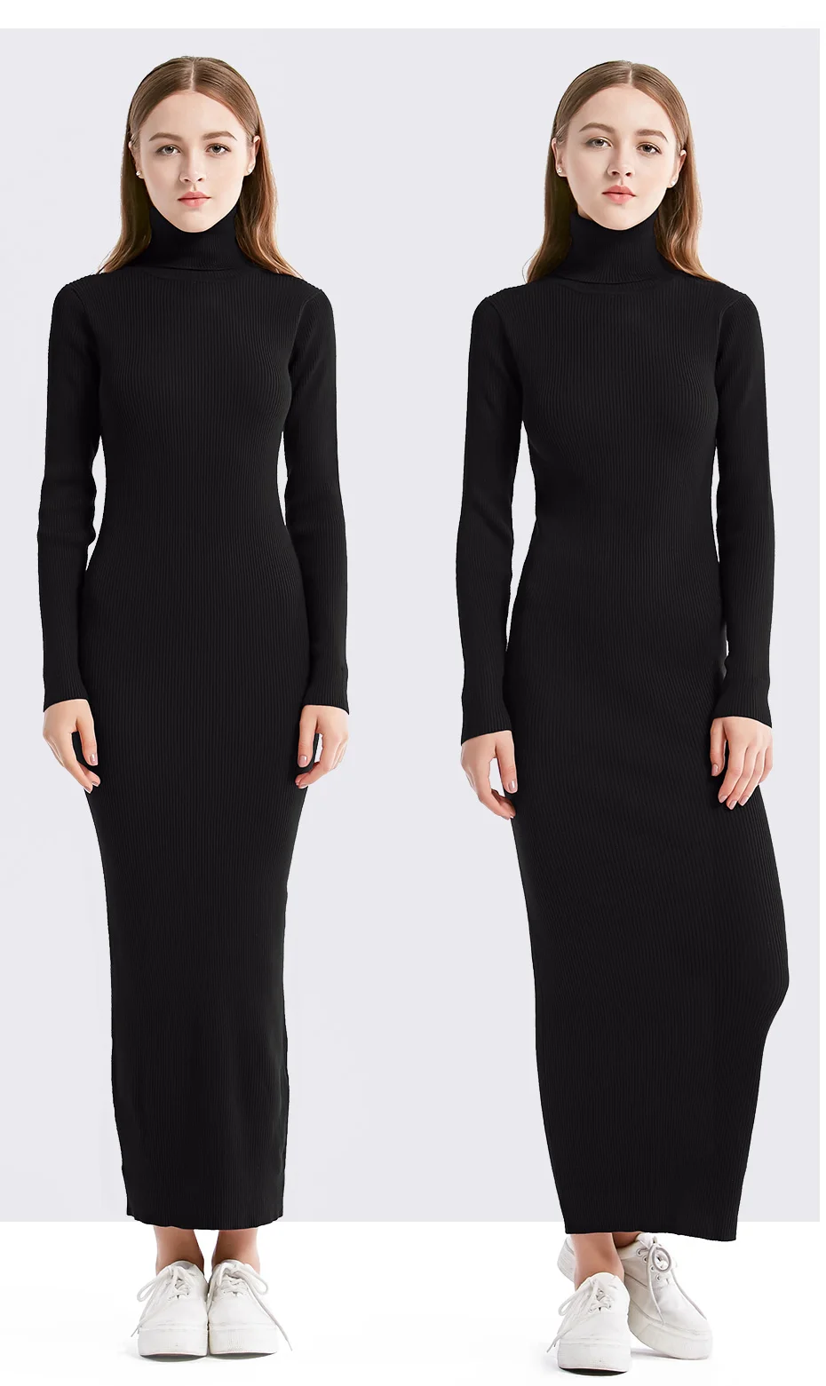 New Fashion Women Sexy Party Dress Knit Style Long Sleeve Turtleneck Winter Maxi Dress Slim Work Wear Office Dress Vestidos