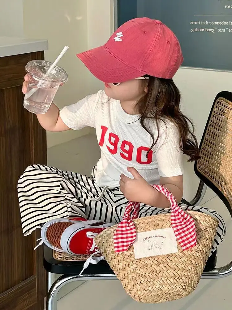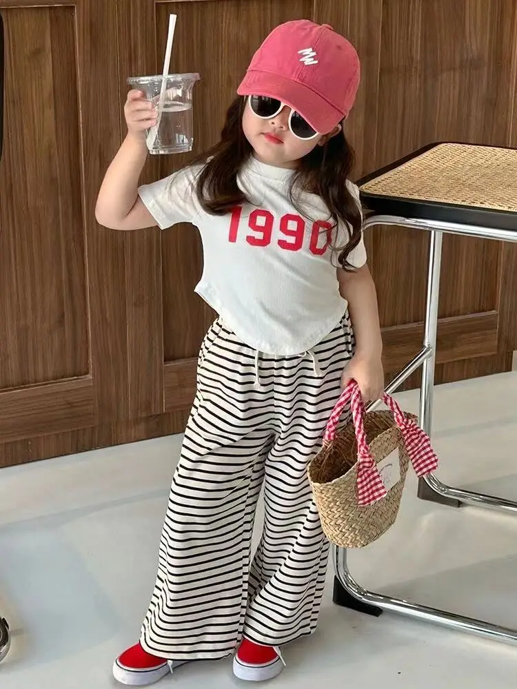 New Girls Short Sleeve Suits Summer Kids T-Shirt Clothing Sets Irregular Tops+Stripes Pants 2Pcs Children Fashion Outfits 2-8Y