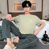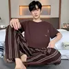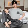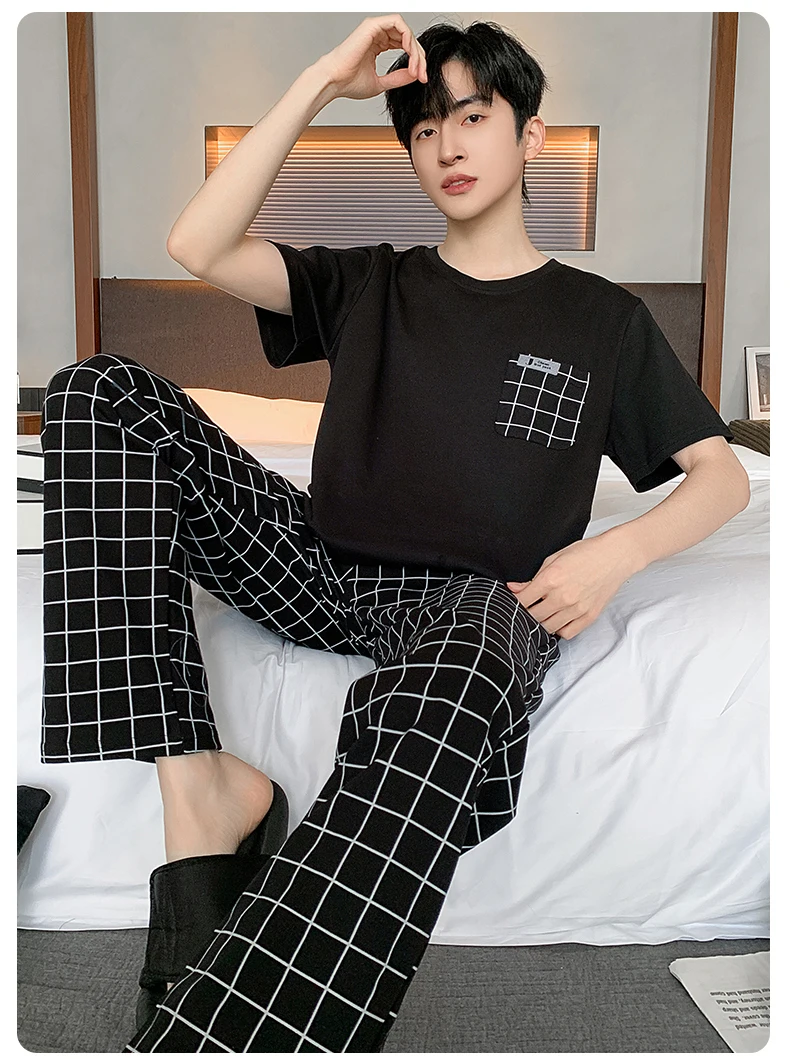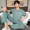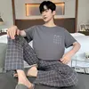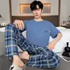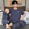 New Summer Soft Cotton Pajamas Set for Men Fashion O-neck Pyjamas Short Sleeved Plaid Pants Home Suit Plus Size L-4XL Pijamas
