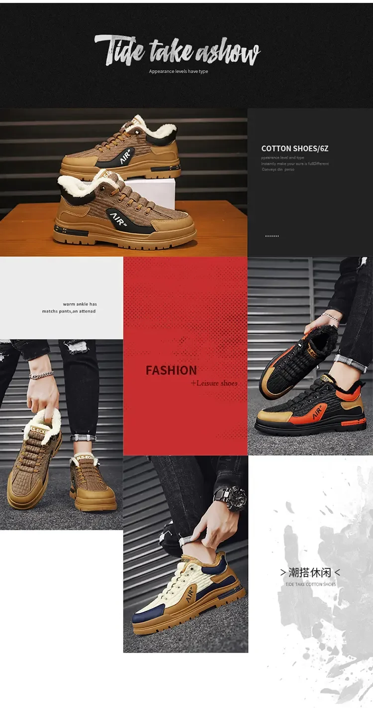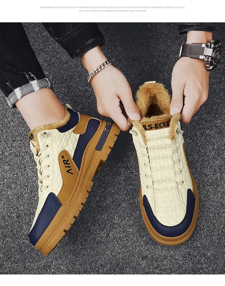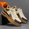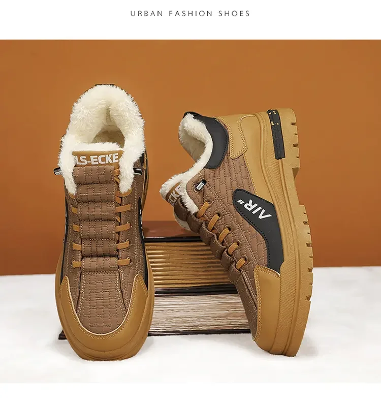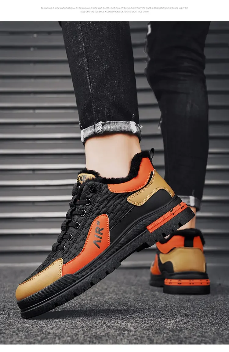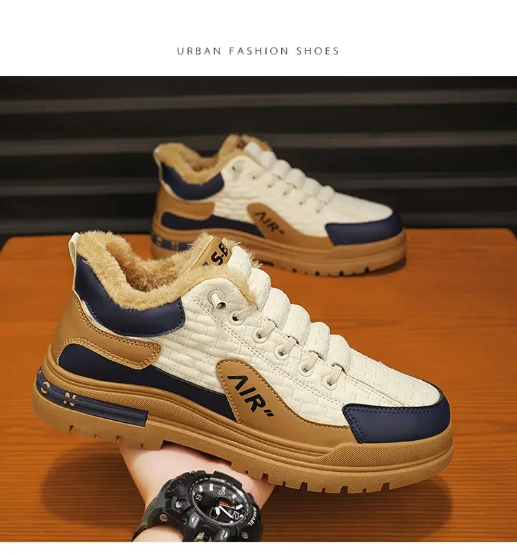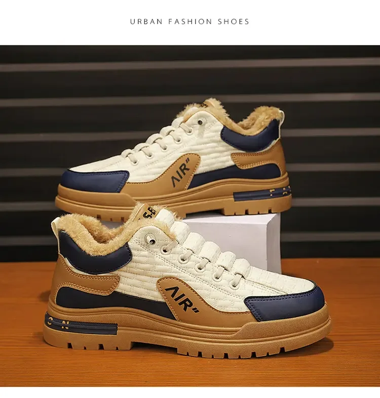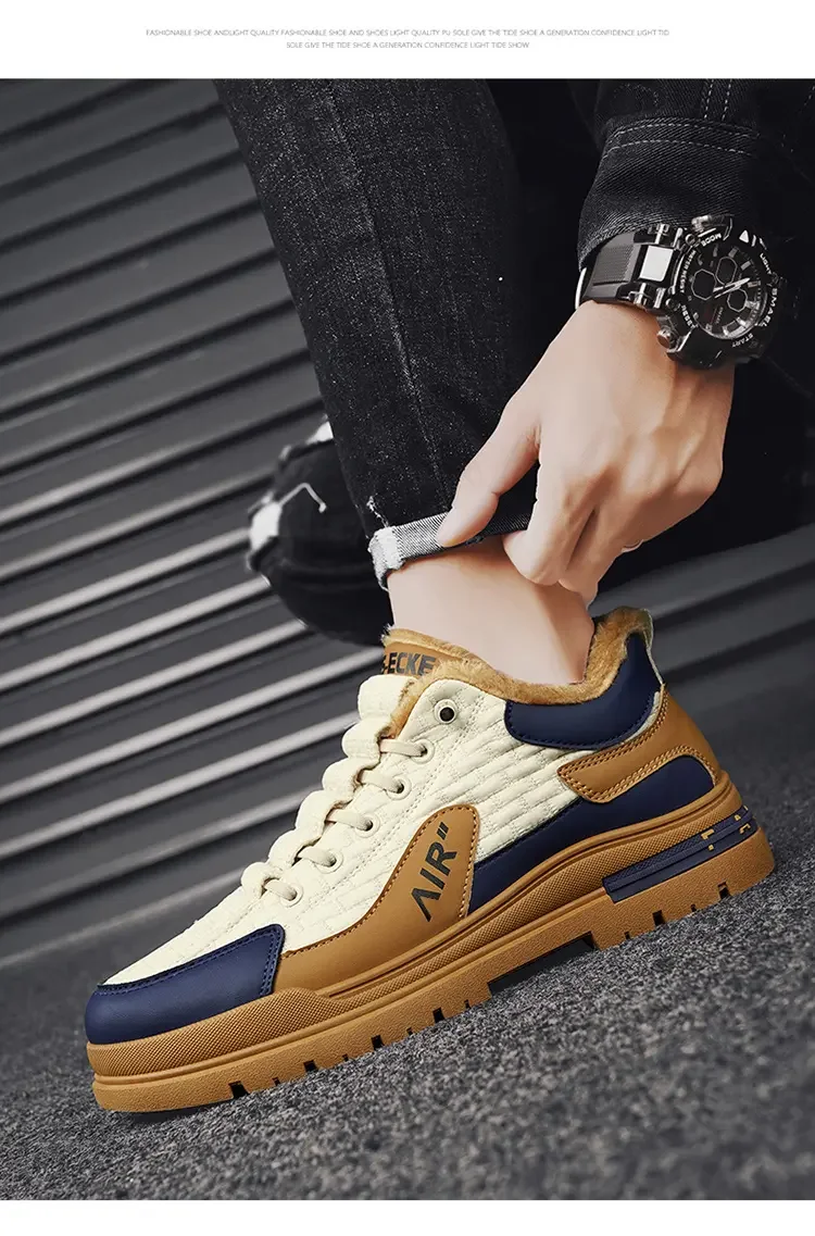 New Winter Furry Warm Men’s Leather Casual Shoes Fashion Designer Patchwork Lace-up Skate Shoes Outdoor Sport Versatile Student
