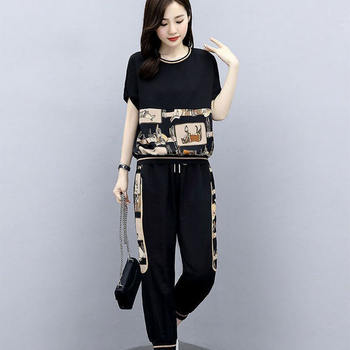 Fashion Summer Women Sets Casual Female Sportswear Suit Printed Short Sleeve Tshirts+ Pants Two-piece Set Large Size