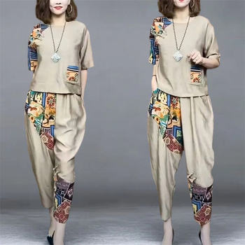 New Arrival 2 Piece Sets Women Casual T-shirt And Ankle-length Pants Summer Vintage Style Loose Female Pant Suits
