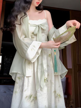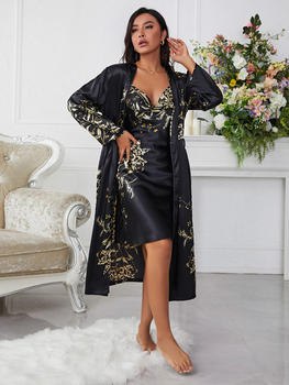 2 Pcs Lady Sexy Nightgown Satin Ice Cherry Printed Halter Pajamas Nightgown Robe V-Neck Women’s Pajamas Loungewear Set