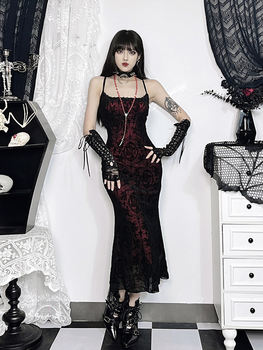 InsGoth Gothic Cross Flocking Sling Fishtail Dress Women’s Retro Velvet Cold Shoulder Spaghetti Strap Wedding Party Dress