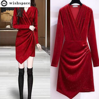 2023 Spring Starry Sky Polka Dot Pleated Korean Velvet Mini Dress Elegant Women Party Dresses Slim Short Robe Evening Red Dress