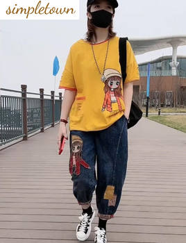 Plus Size Cartoon Letter Printed Short Sleeved T-shirt Loose Denim Two-piece Elegant Women’s Pants Set Summer Outfits Clothing