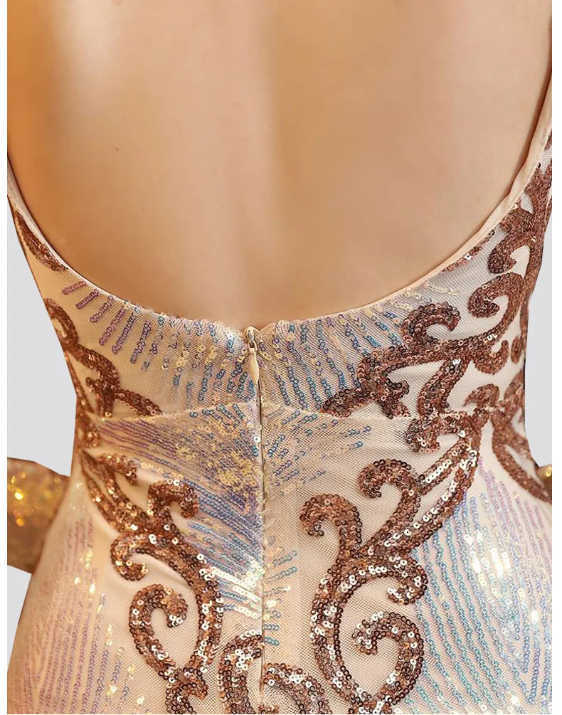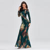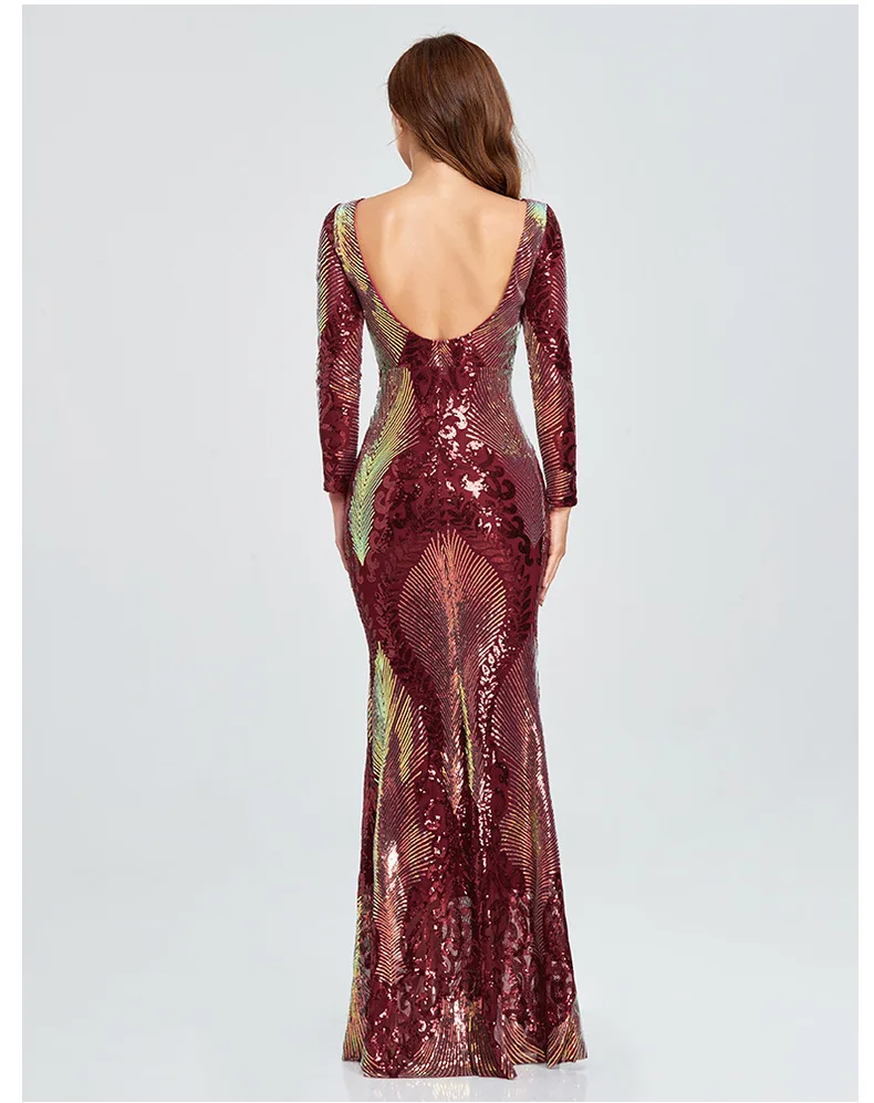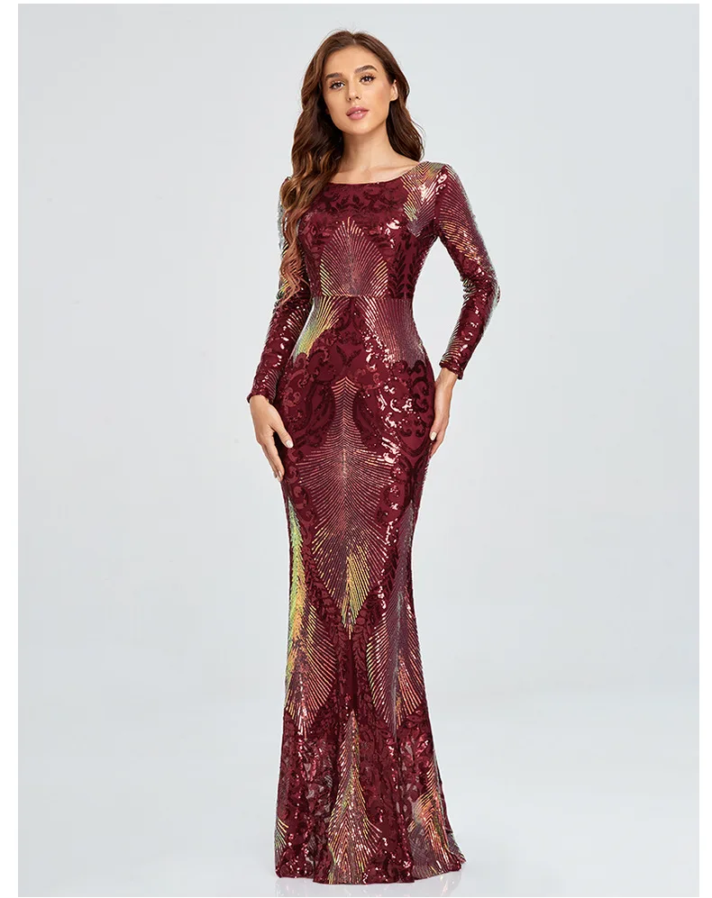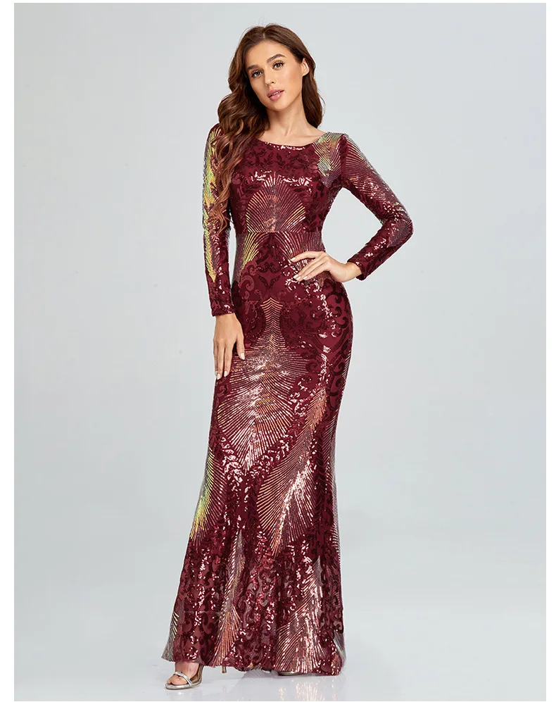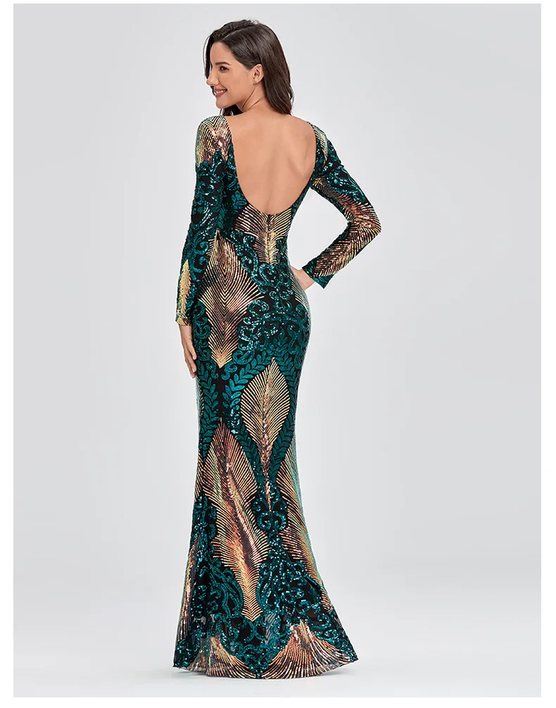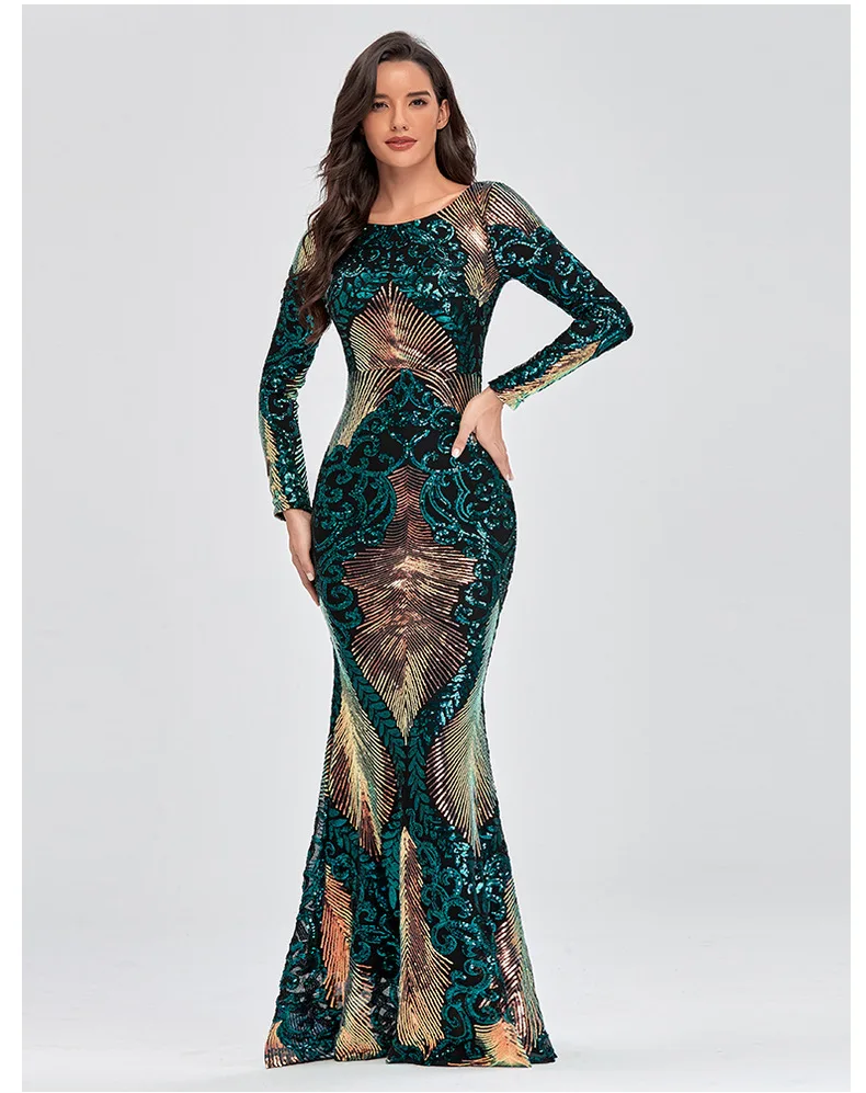 Pdmcms Vintage Green Long Sleeve Mermaid Sequins Dress Sparkly Elegant Shiny Party Evening Long Dresses for Women Female
