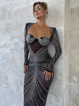 Mozision Glitter Mesh See Through Party Maxi Dress For Women Fashion Full Sleeve Bodycon Sexy Club Long Evening Dress Vestido