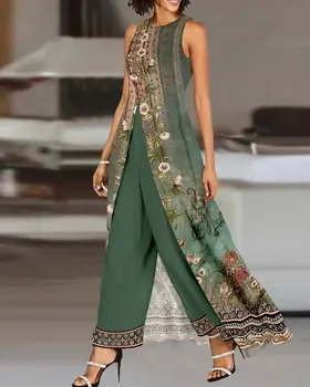 Autumn Women Floral Tribal Print Patchwork Wide Leg Jumpsuit Party New Fashion O-Neck Overalls Lady Asymmetrical Jumpsuits Robe
